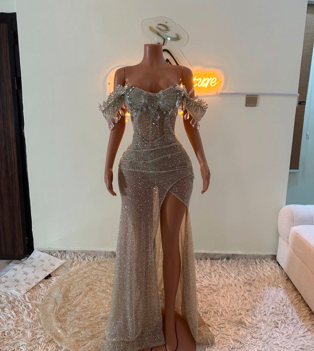 как выглядит Size 4, Beige/sheer custom-made prom dress фото