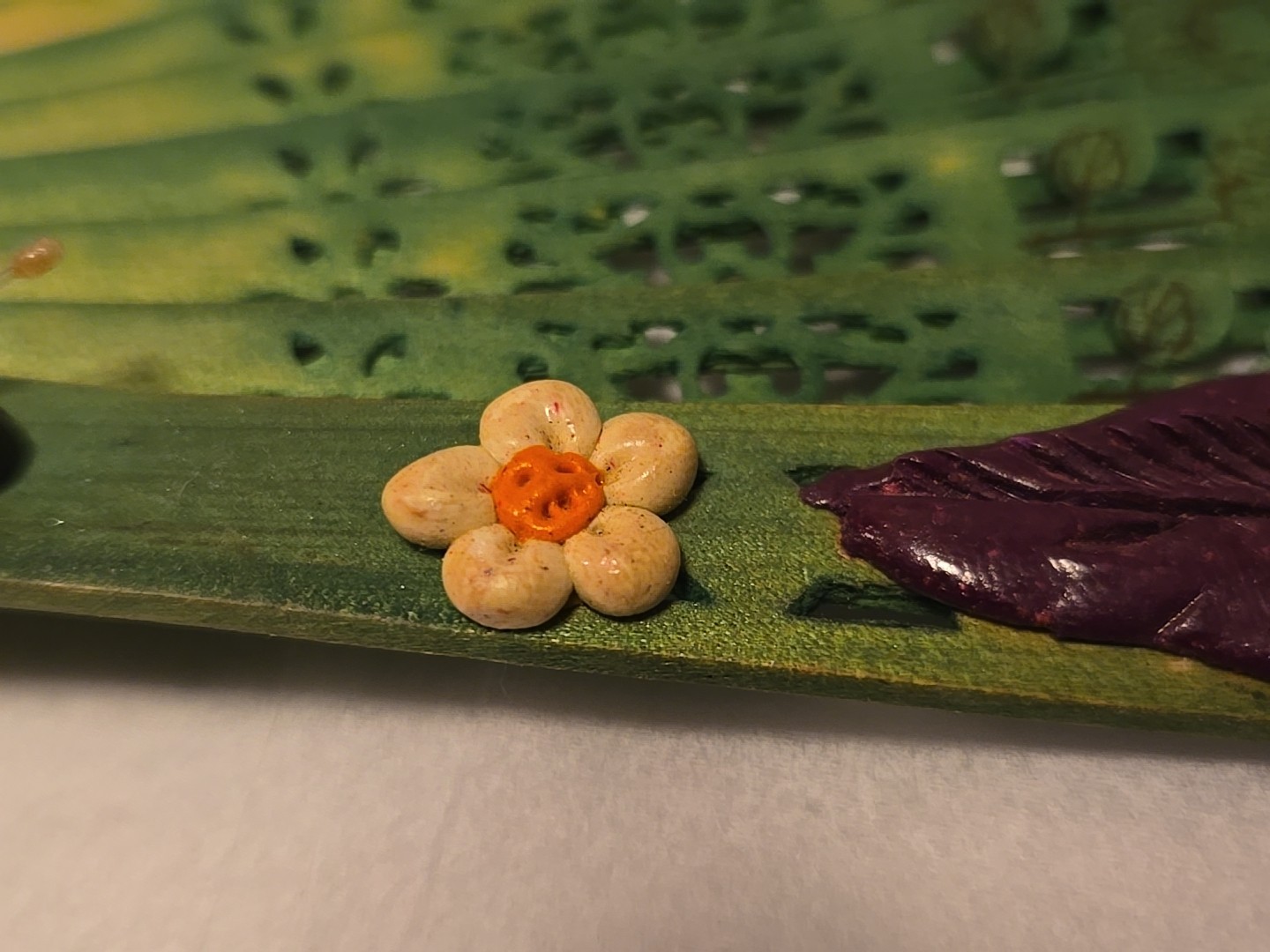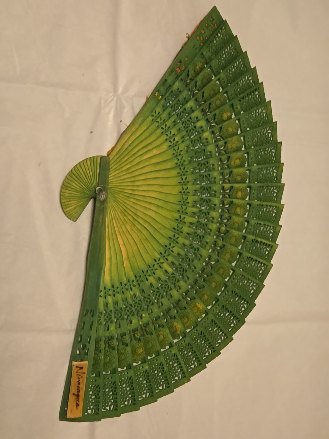 Vintage Green Wooden Spanish Folding Fan W/ Clay Lady Bug Decoration Nicaragua