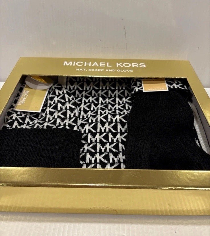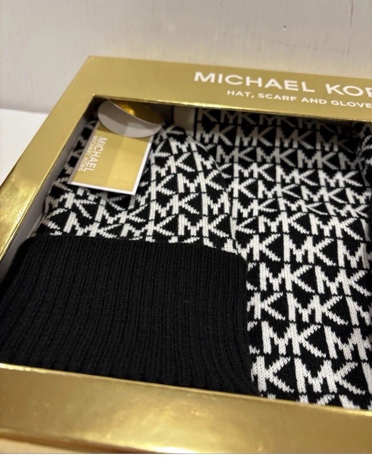 NWT Authentic Michael Kors Knit 3 Pieces Set Hat Scarf Gloves Black Color 98