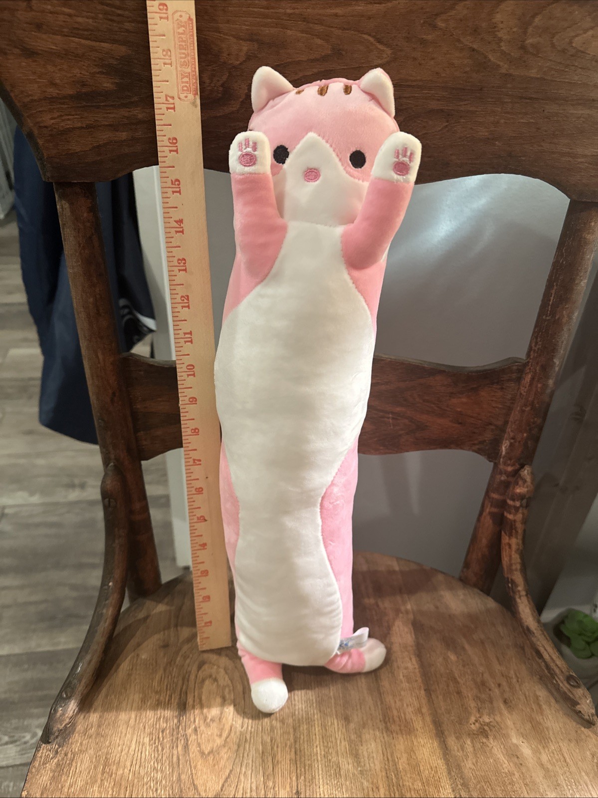 как выглядит Long Cat plush pillow toy in pink and white фото