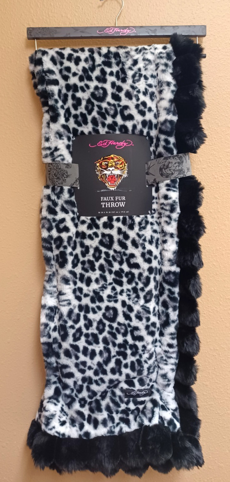 Ed Hardy Faux Fur Throw Blanket Grey/White/Black Snow Leopard Print 50x70 New