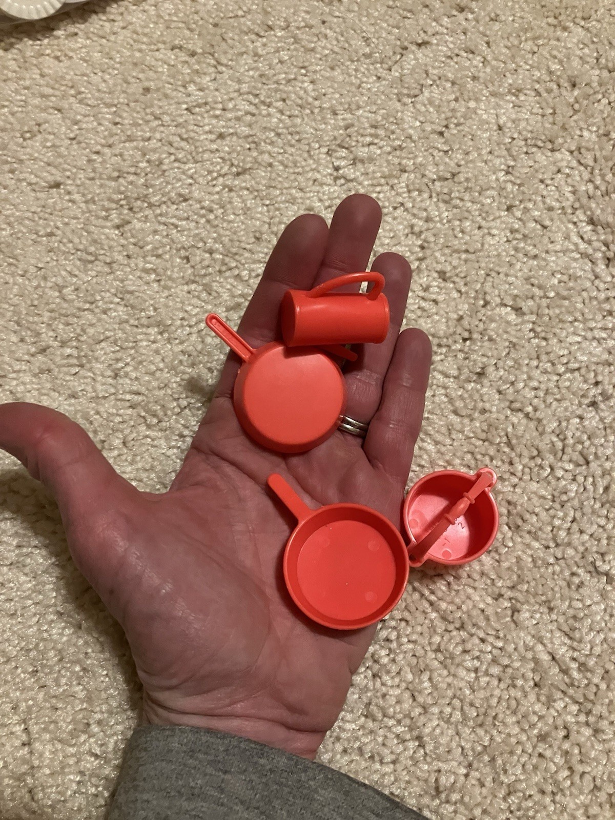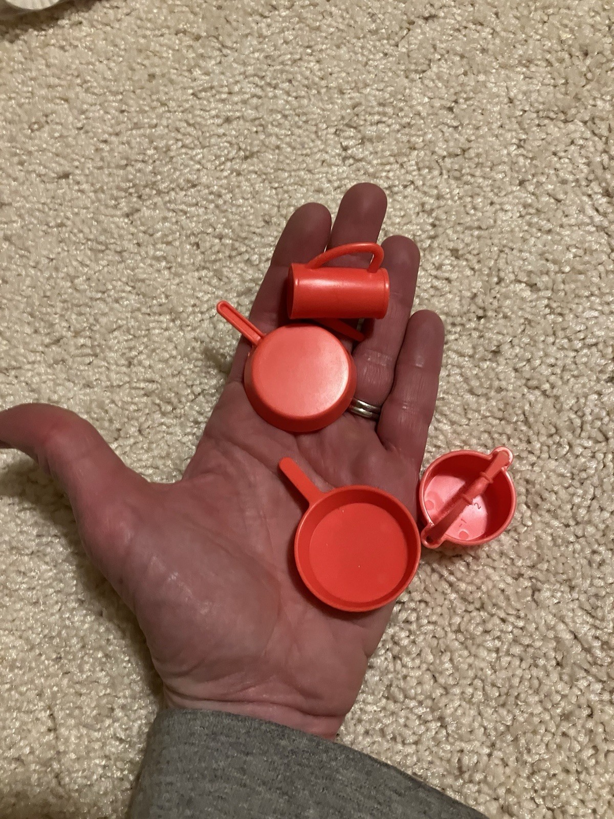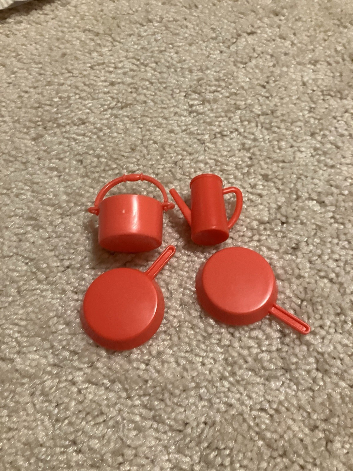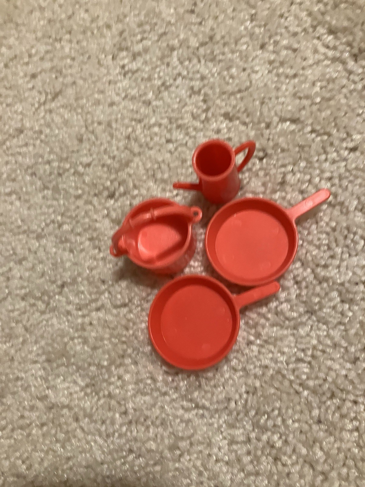 как выглядит VTG Barbie doll cookware camping pots pans pitcher red 4 pc kitchenware EUC фото