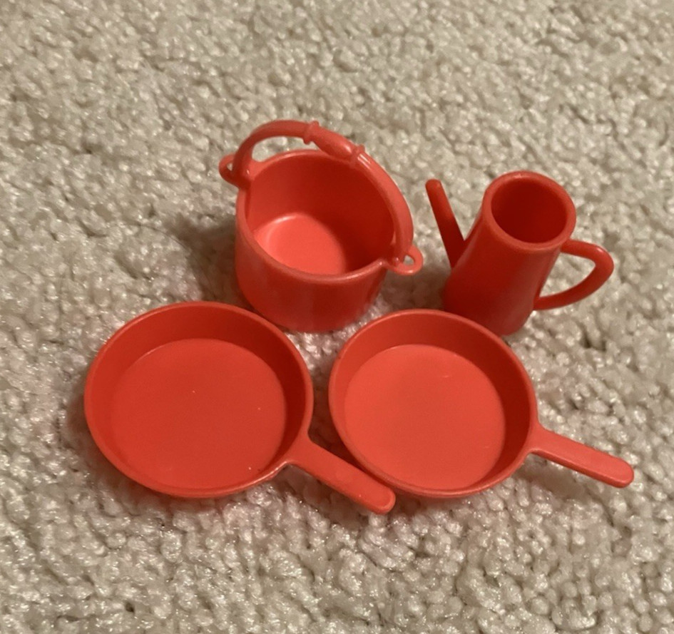 VTG Barbie doll cookware camping pots pans pitcher red 4 pc kitchenware EUC