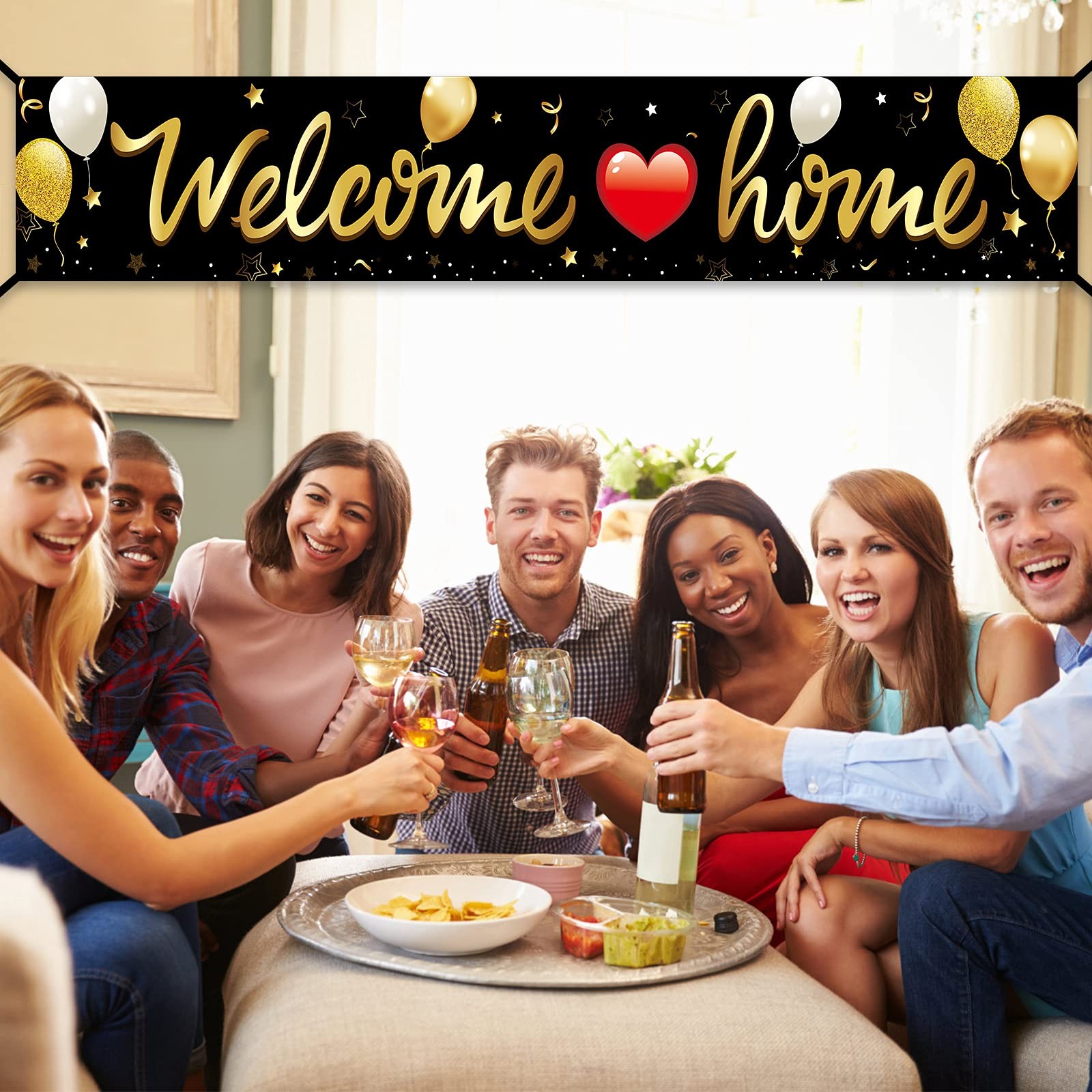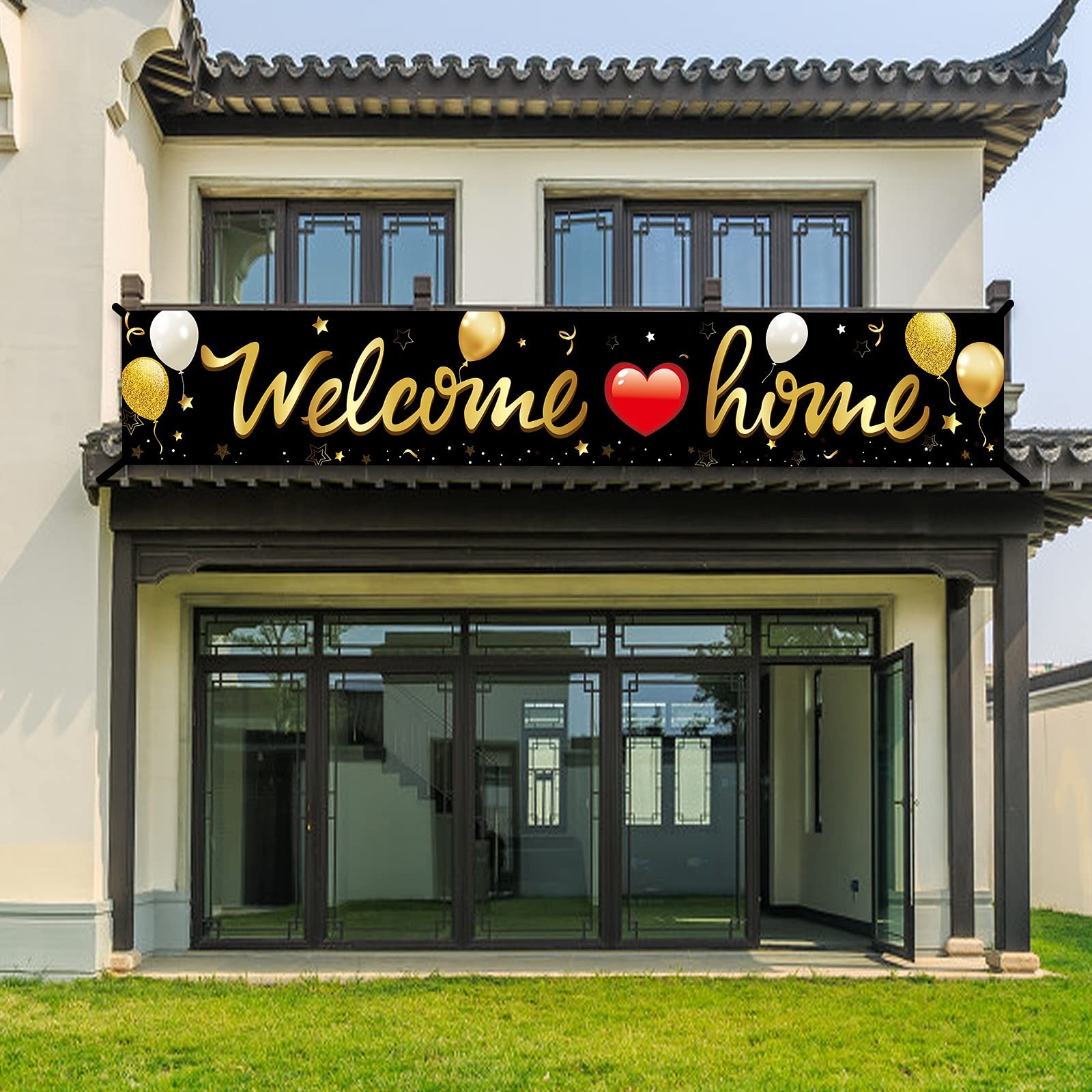 Welcome Home Banner Decoration, Black Gold Welcome Back Home Yard Sign for Ou...