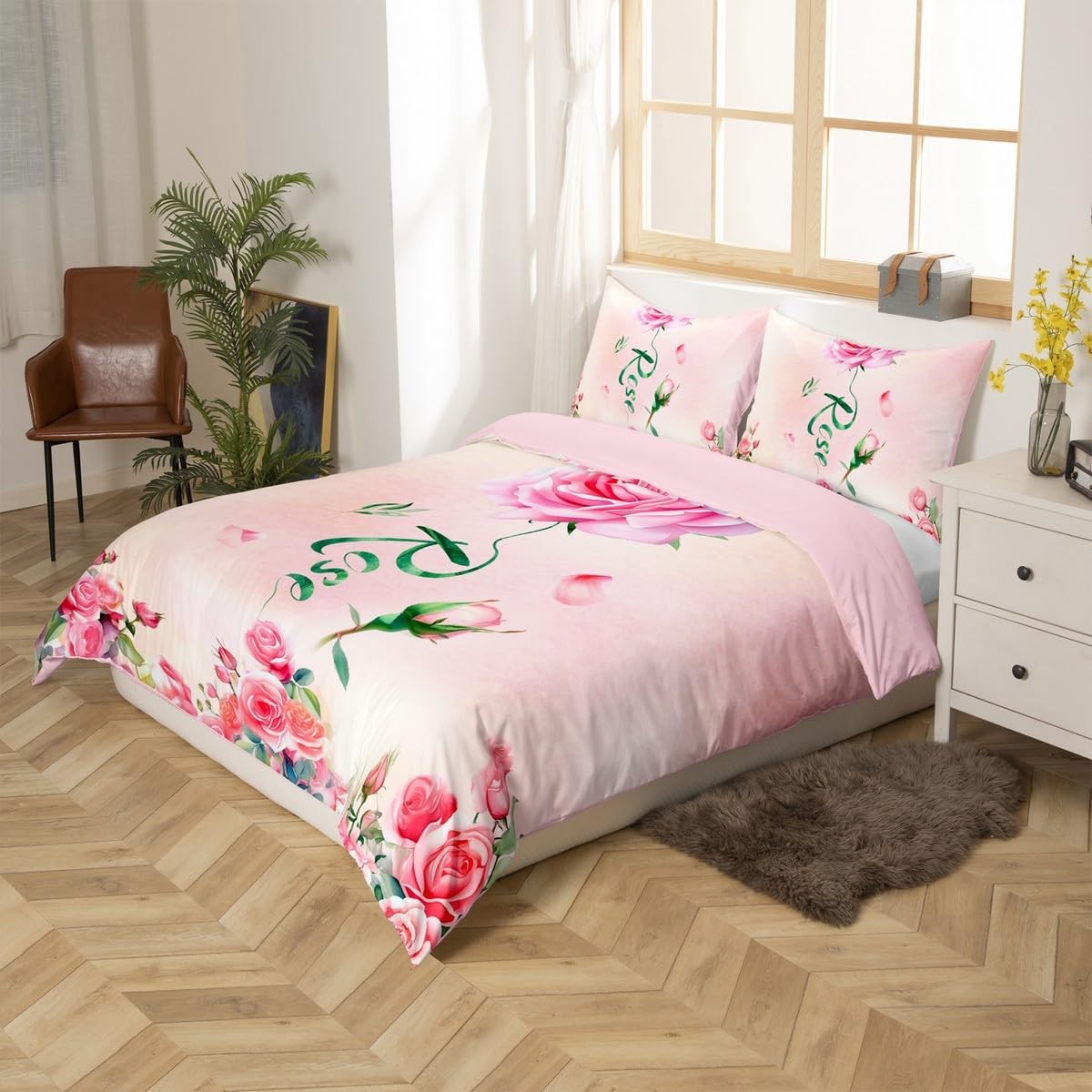 как выглядит Pink Rose Duvet Cover Set Twin Size,2 Pcs Breathable Garden Flowers Bedding S... фото