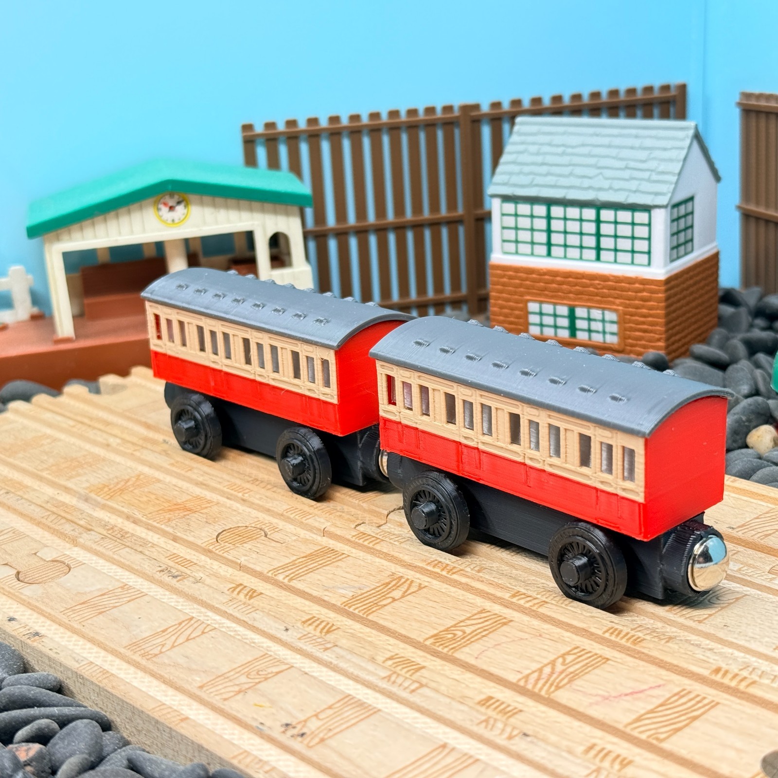 Wooden Railway 2 Branch line Passenger Coach Red Tan Custom for Thomas Train