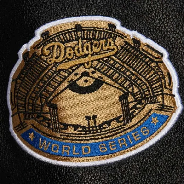 как выглядит Los Angeles Dodgers Black Out Full-Snap Wool/Leather Varsity Letterman Jacket фото