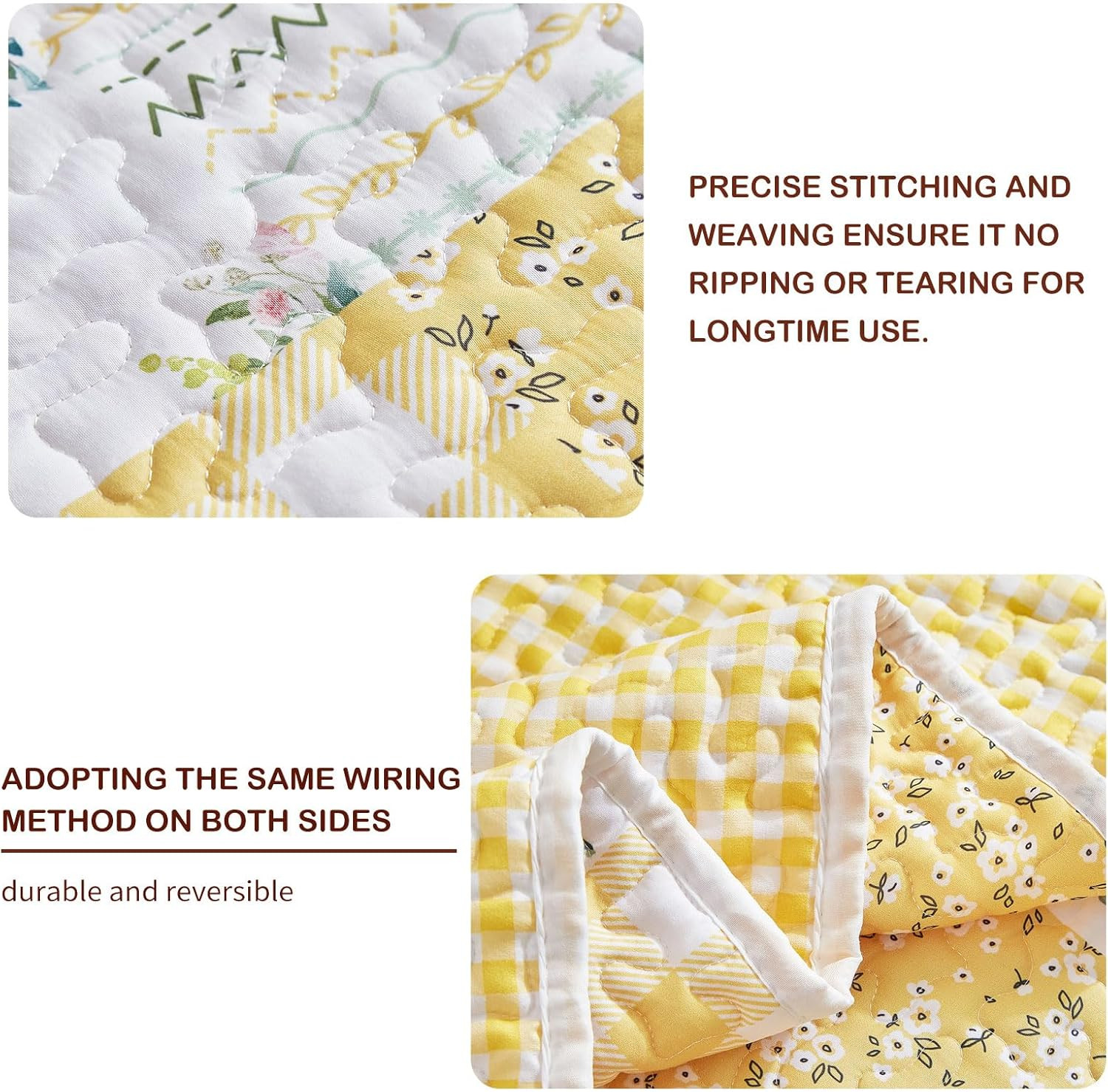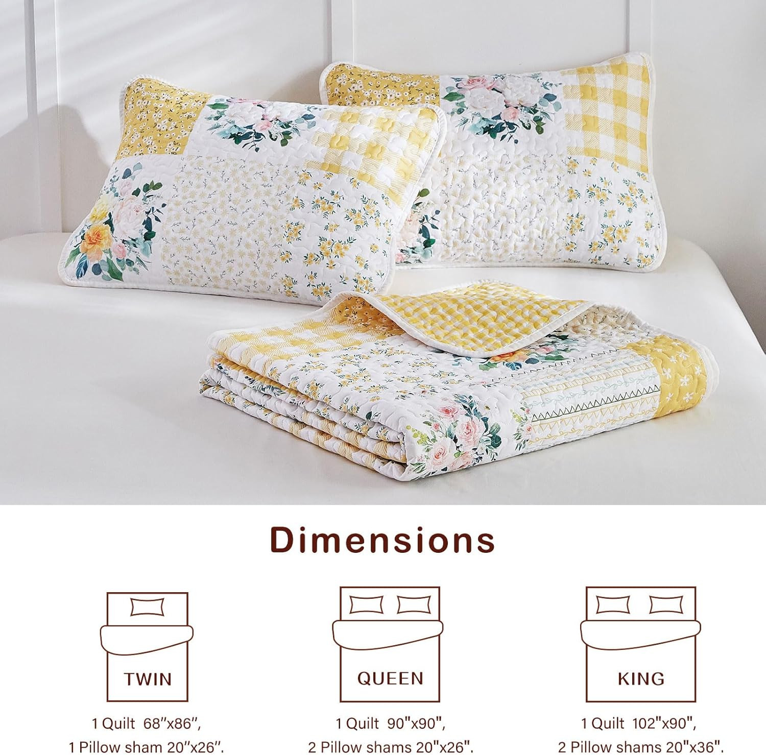 3-Piece Floral Patchwork Quilt Set Queen Yellow White Microfiber Bedspread