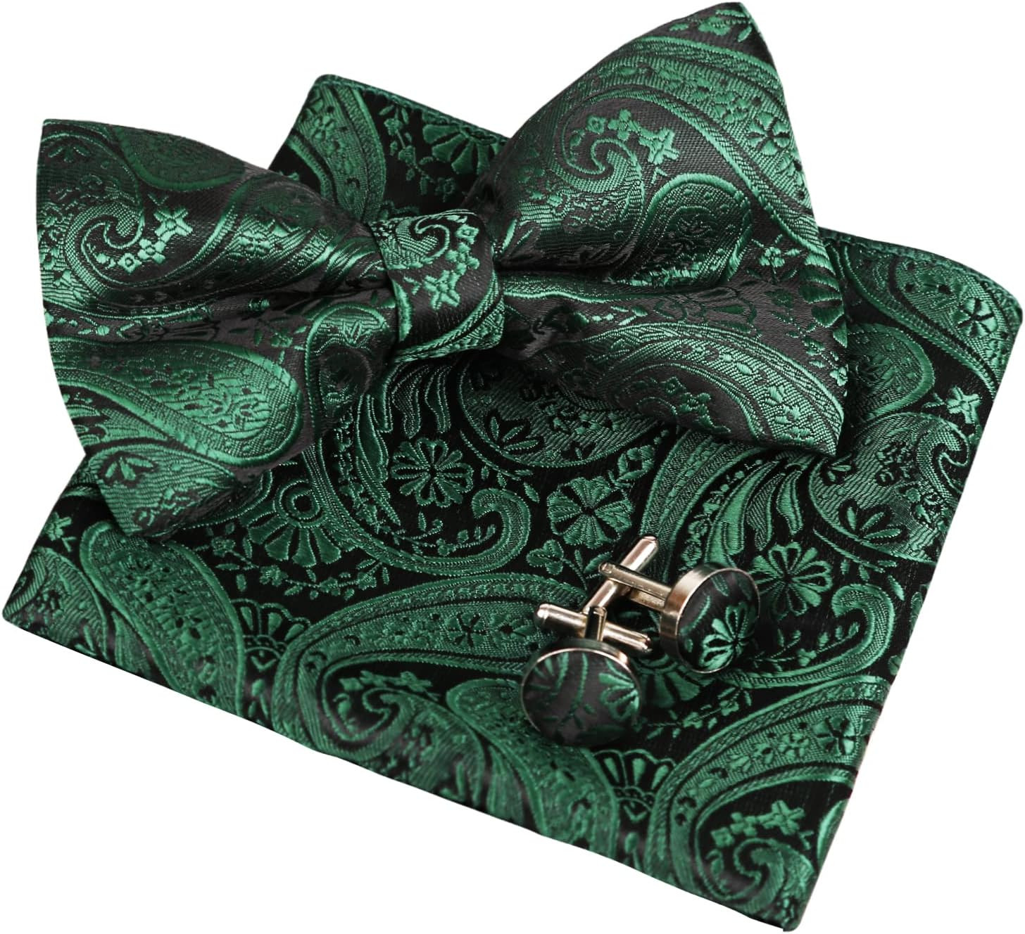 Mens Paisley Bow Tie, Pocket Square Cufflinks Set Pre-Tied Adjustable