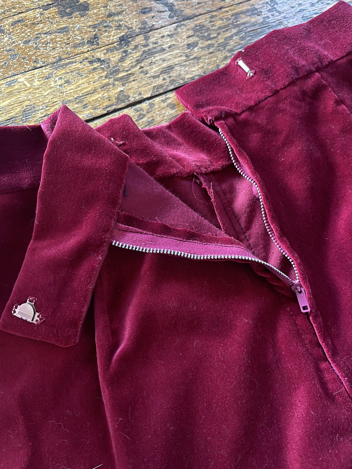 как выглядит Vintage 1970s Style Red Velvet Bell Bottoms Velour Brass Button 1960 April Rhain фото