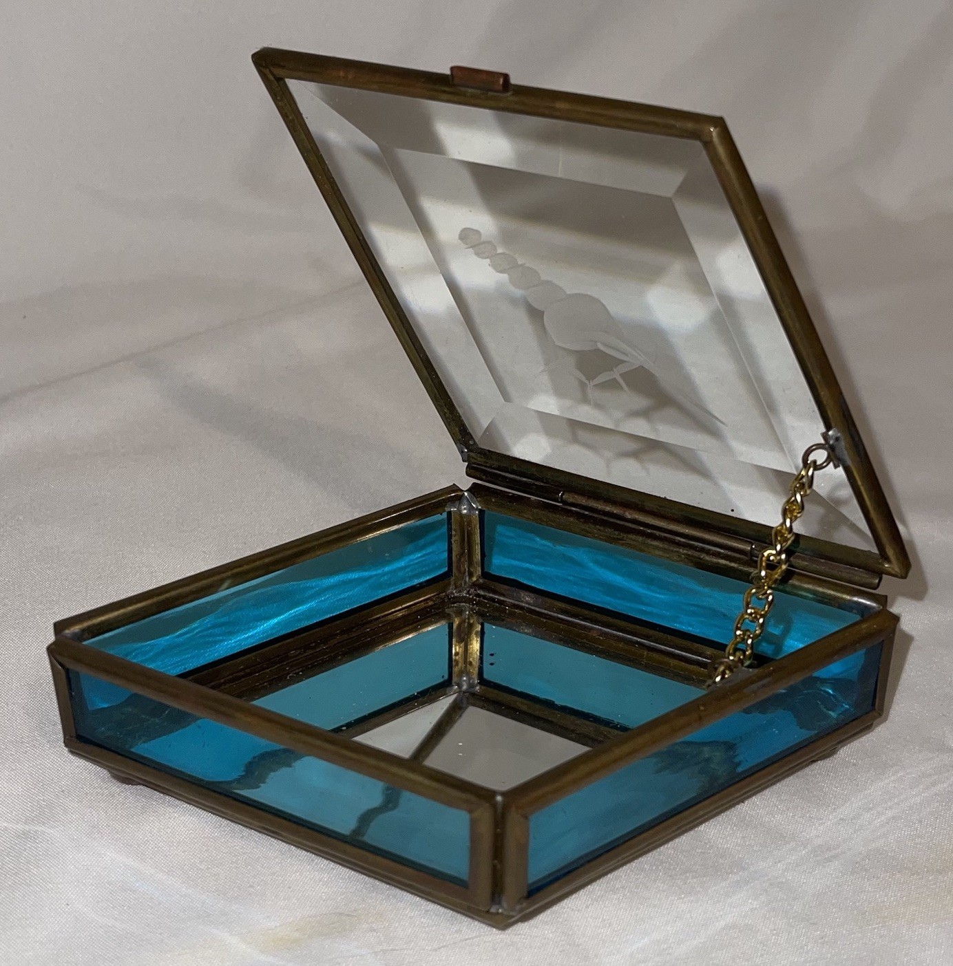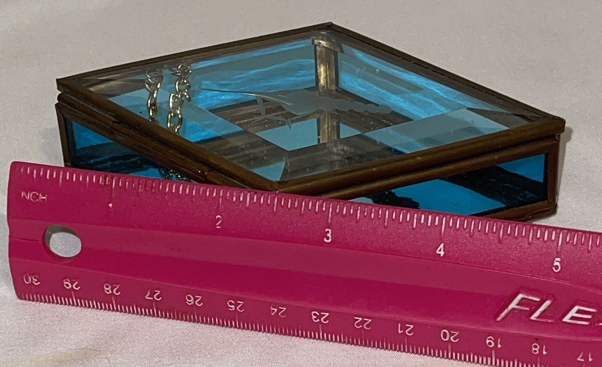 как выглядит Vintage Brass Blue Leaded Glass w/Mirror Small Trinket Jewelry Box фото