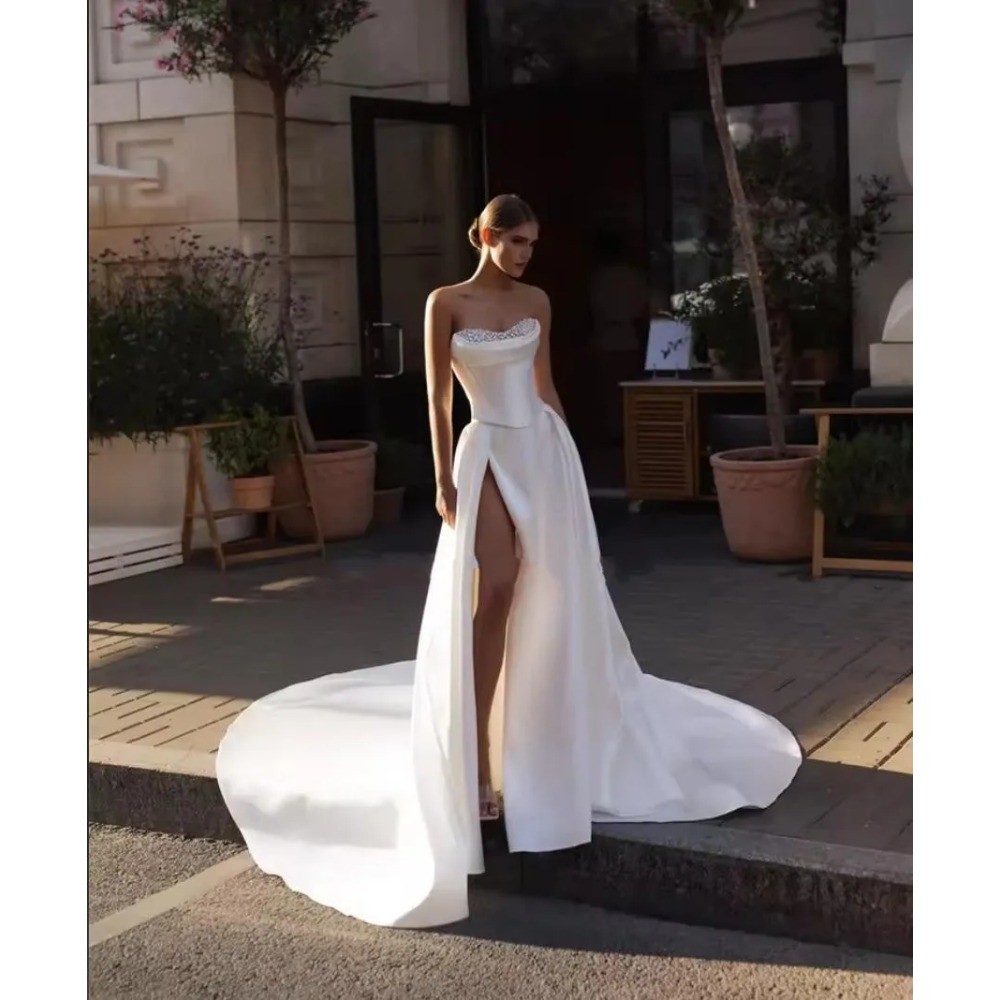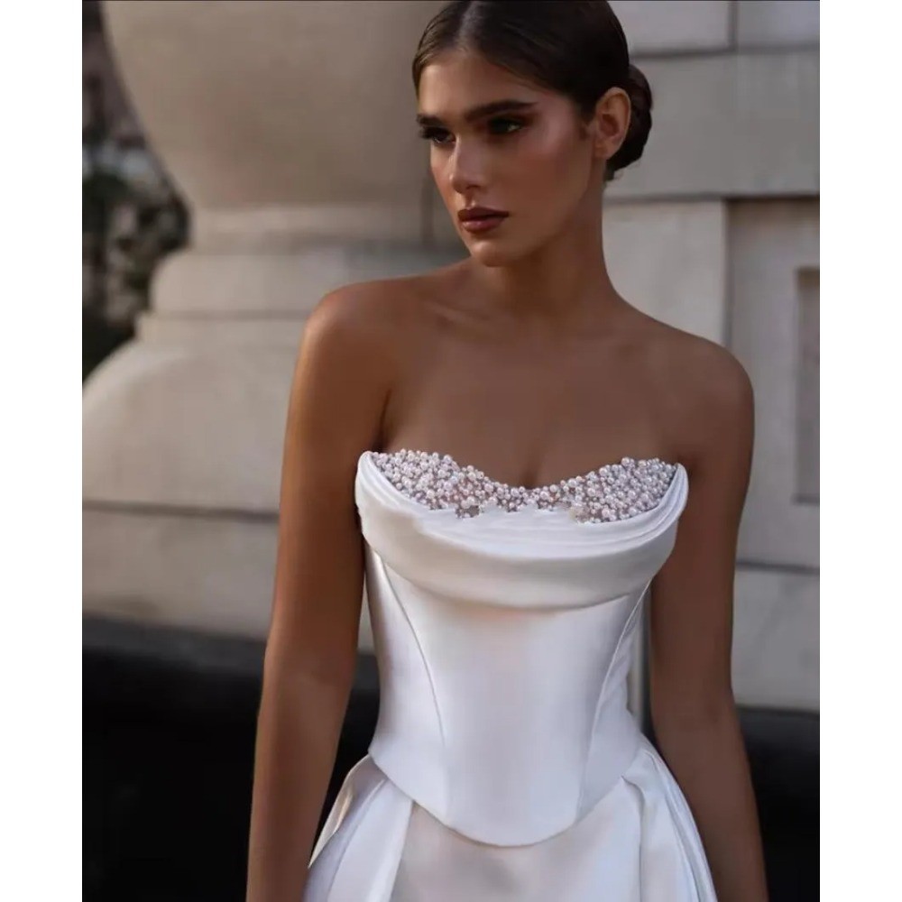White Satin A Line Wedding Dresses Pearls Strapless Basque Boho Bridal Gowns
