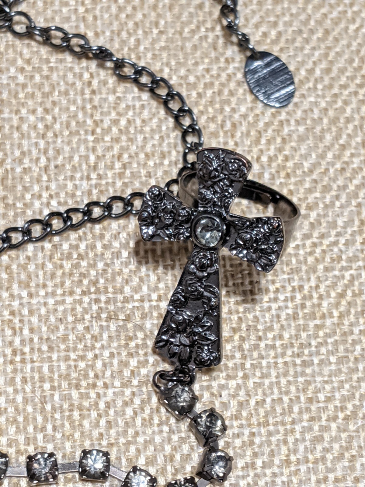 как выглядит Black Metallic Floral Rhinestone Cross Chain Ring Bracelet Size 6 Goth фото