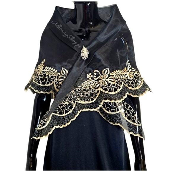 Handmade Filipino Alampay Shawl Organza Cutwork Embroidery w/ Brooch