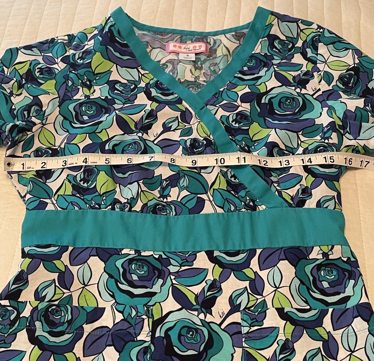 KOI By Kathy Peterson Women s S Blue Teal Lime Green Roses Scrub Top 100 Cotton