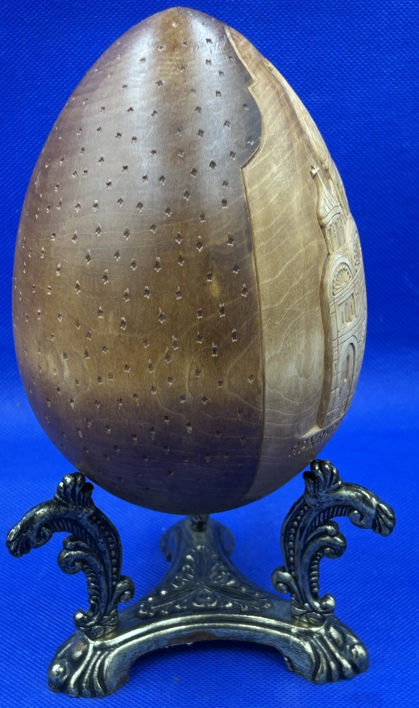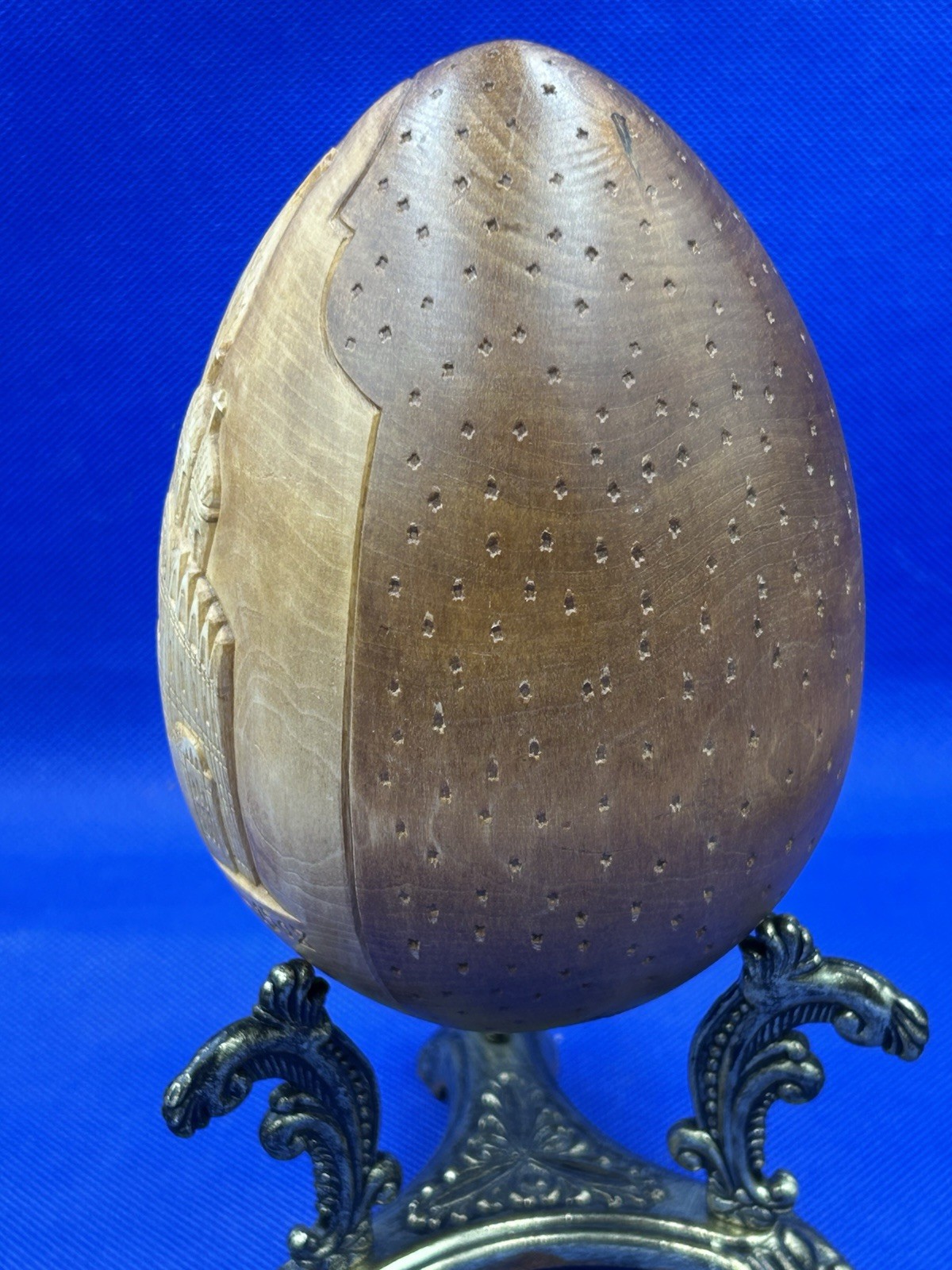 Vintage Russian Wooden Egg Beautiful Scene Hand Carved Egg Moscow 5 3/4 Tall