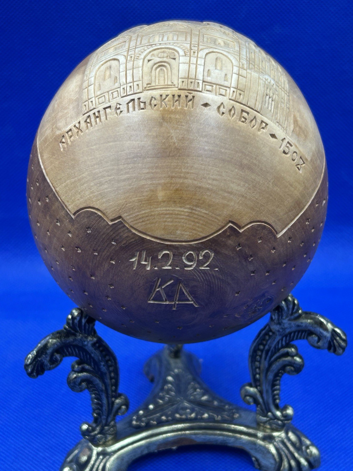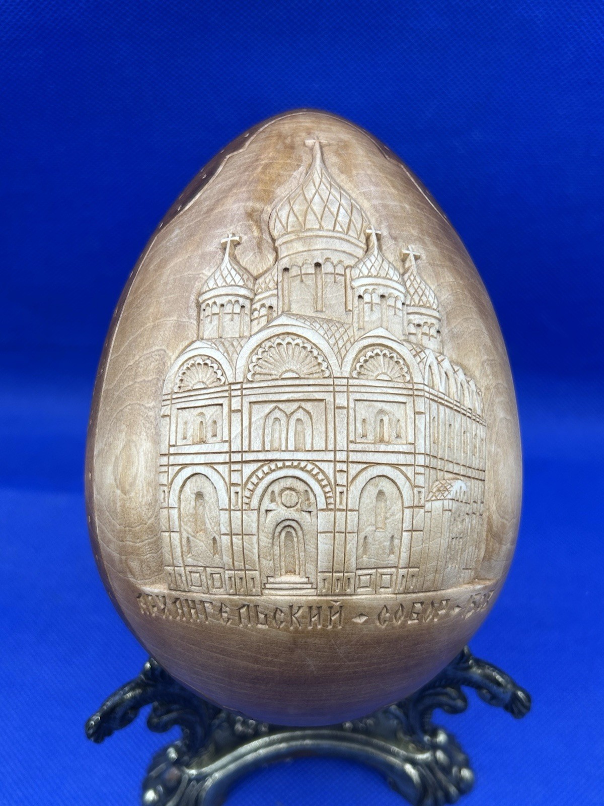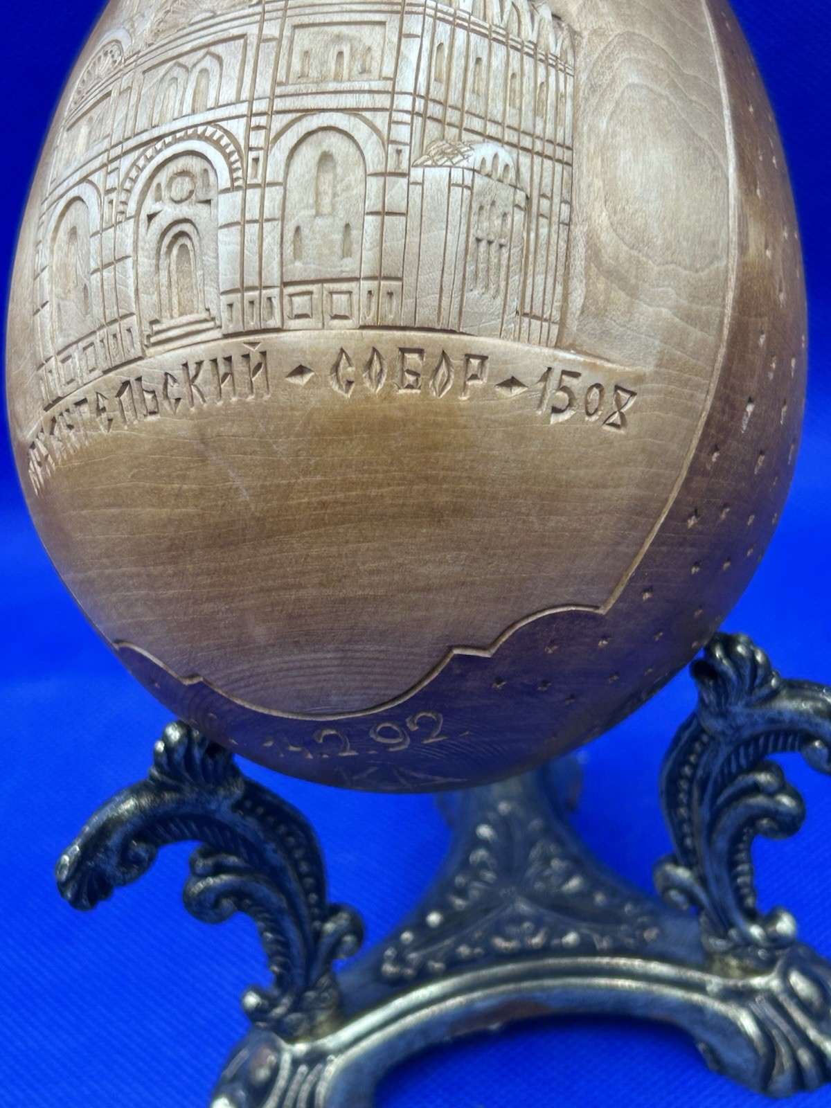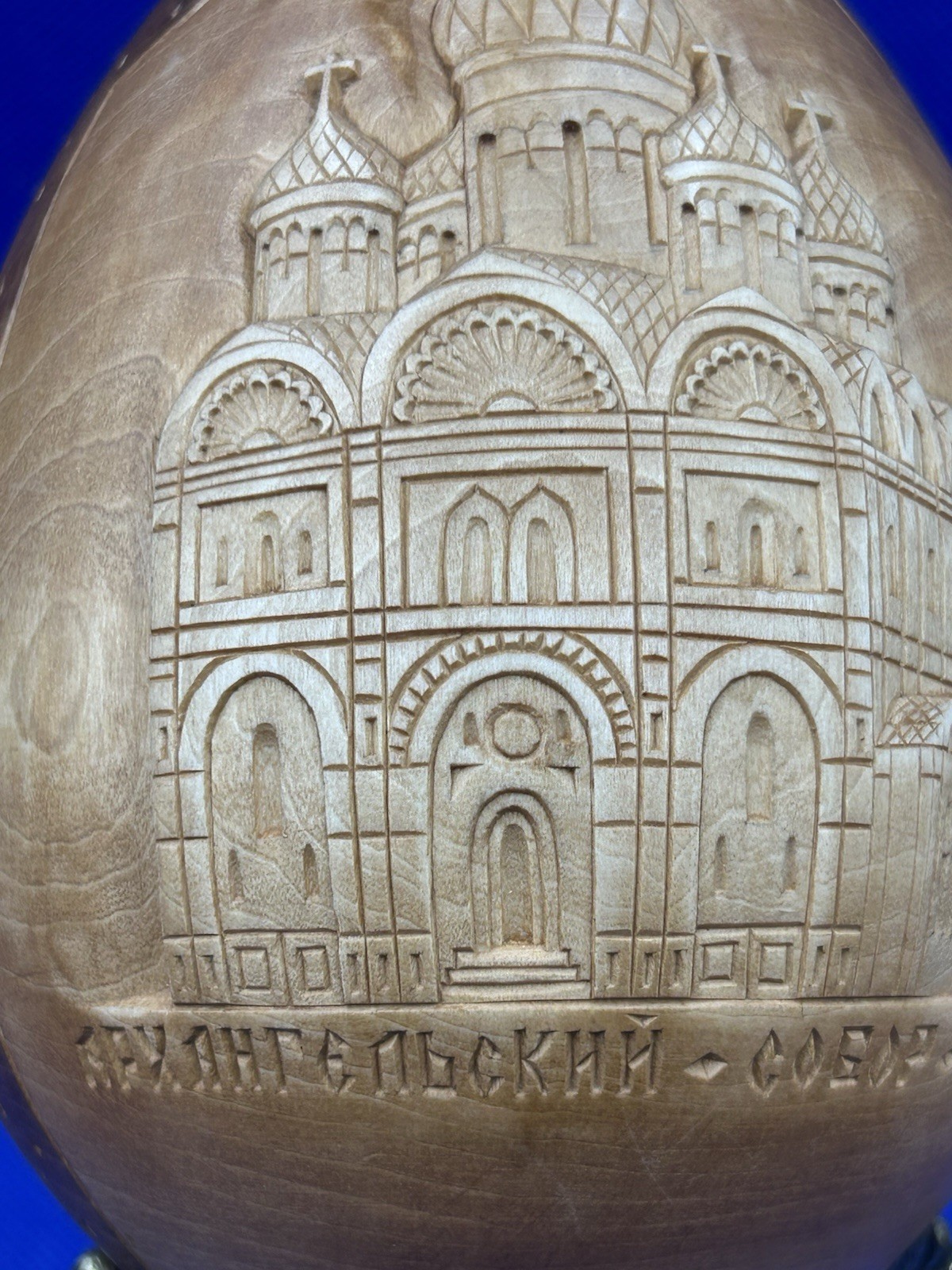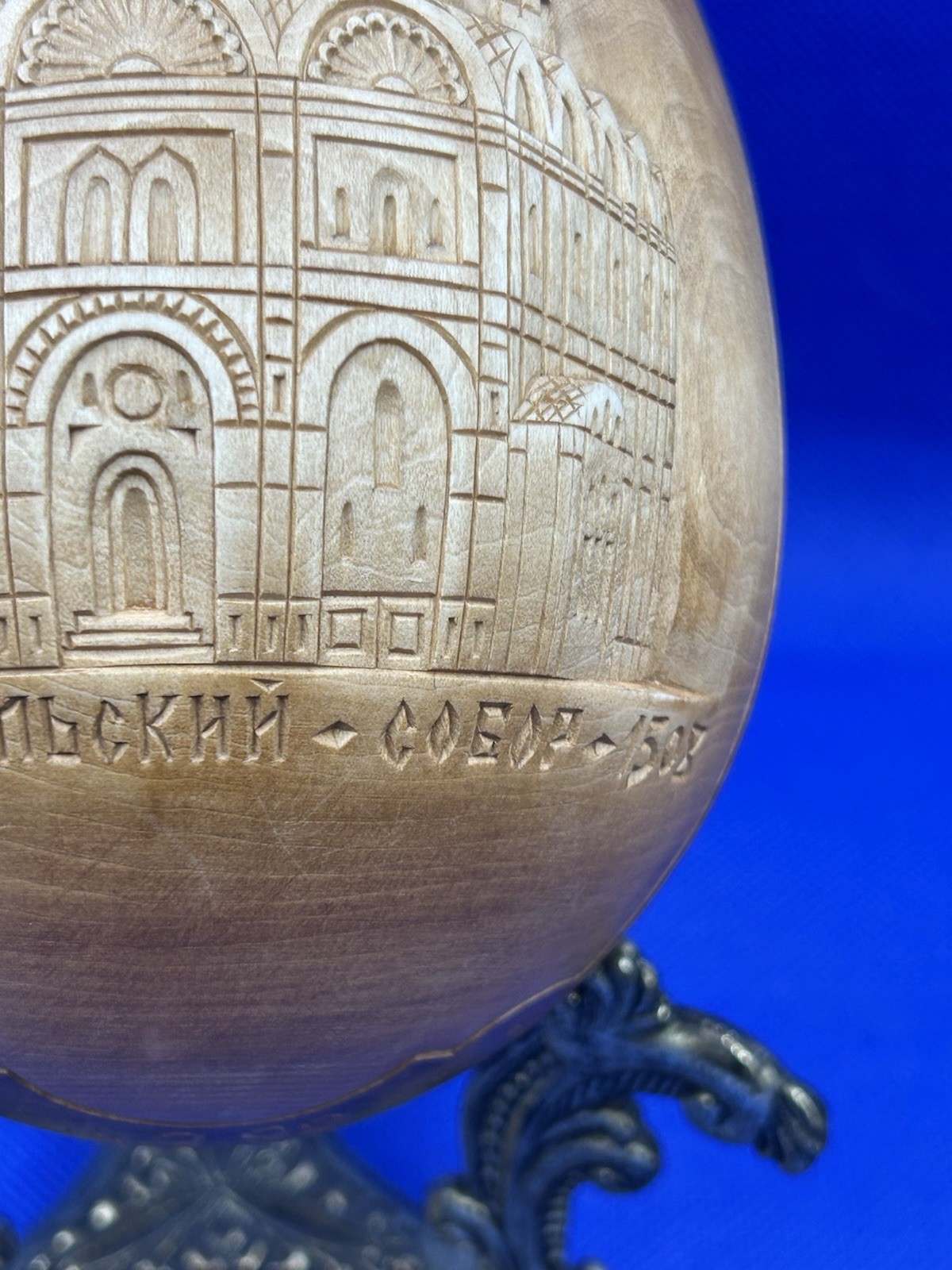 как выглядит Vintage Russian Wooden Egg Beautiful Scene Hand Carved Egg Moscow 5 3/4 Tall фото