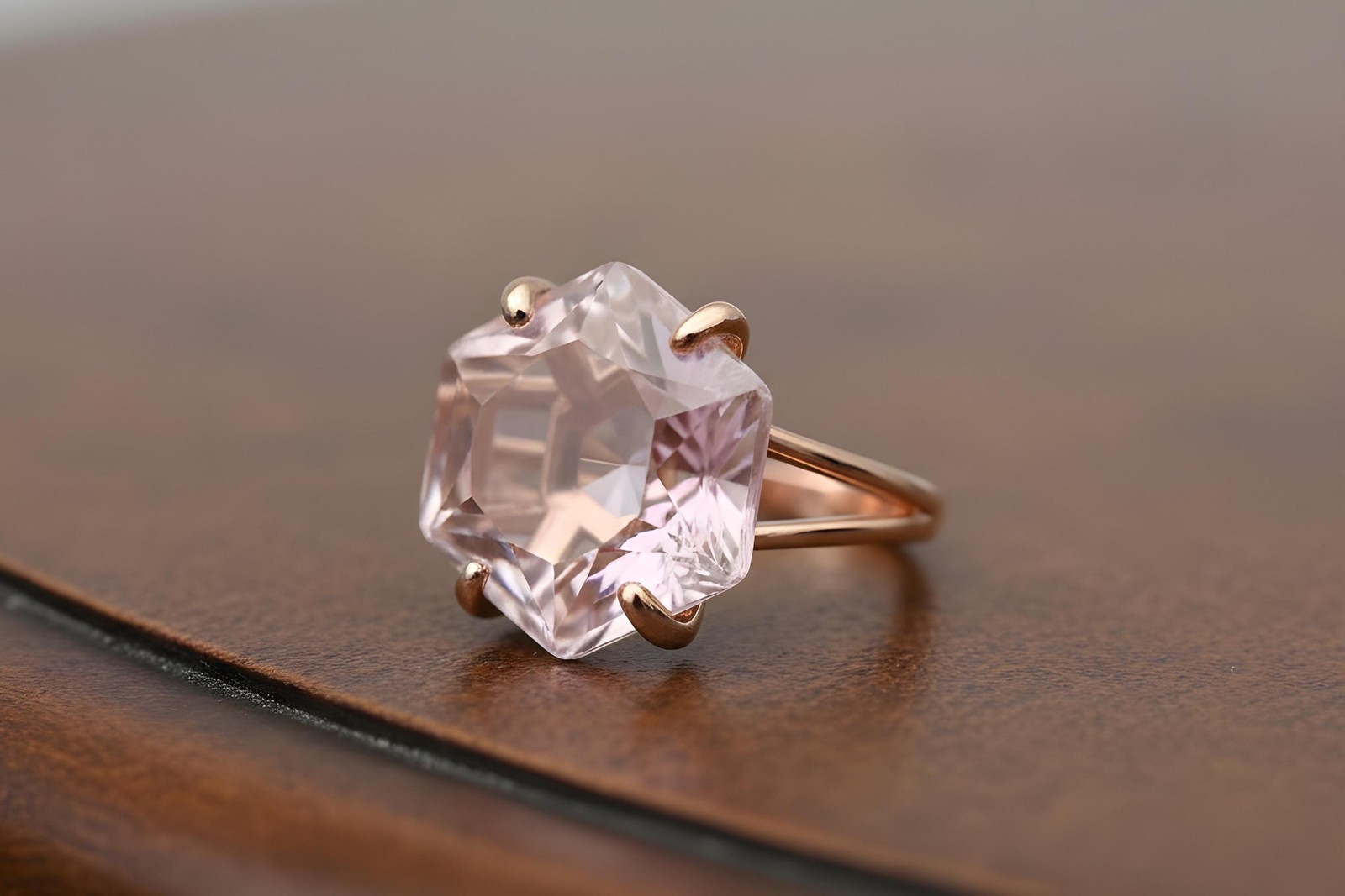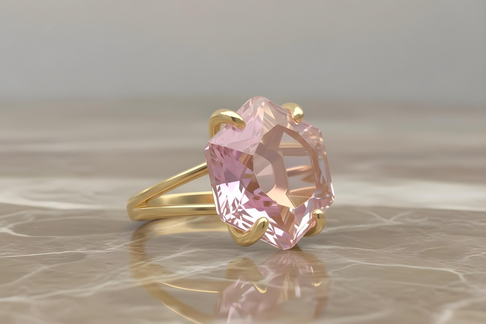 как выглядит Rose Quartz Ring Anemone Jewelry Hexagon Cut Yellow Gold Solid Pink фото