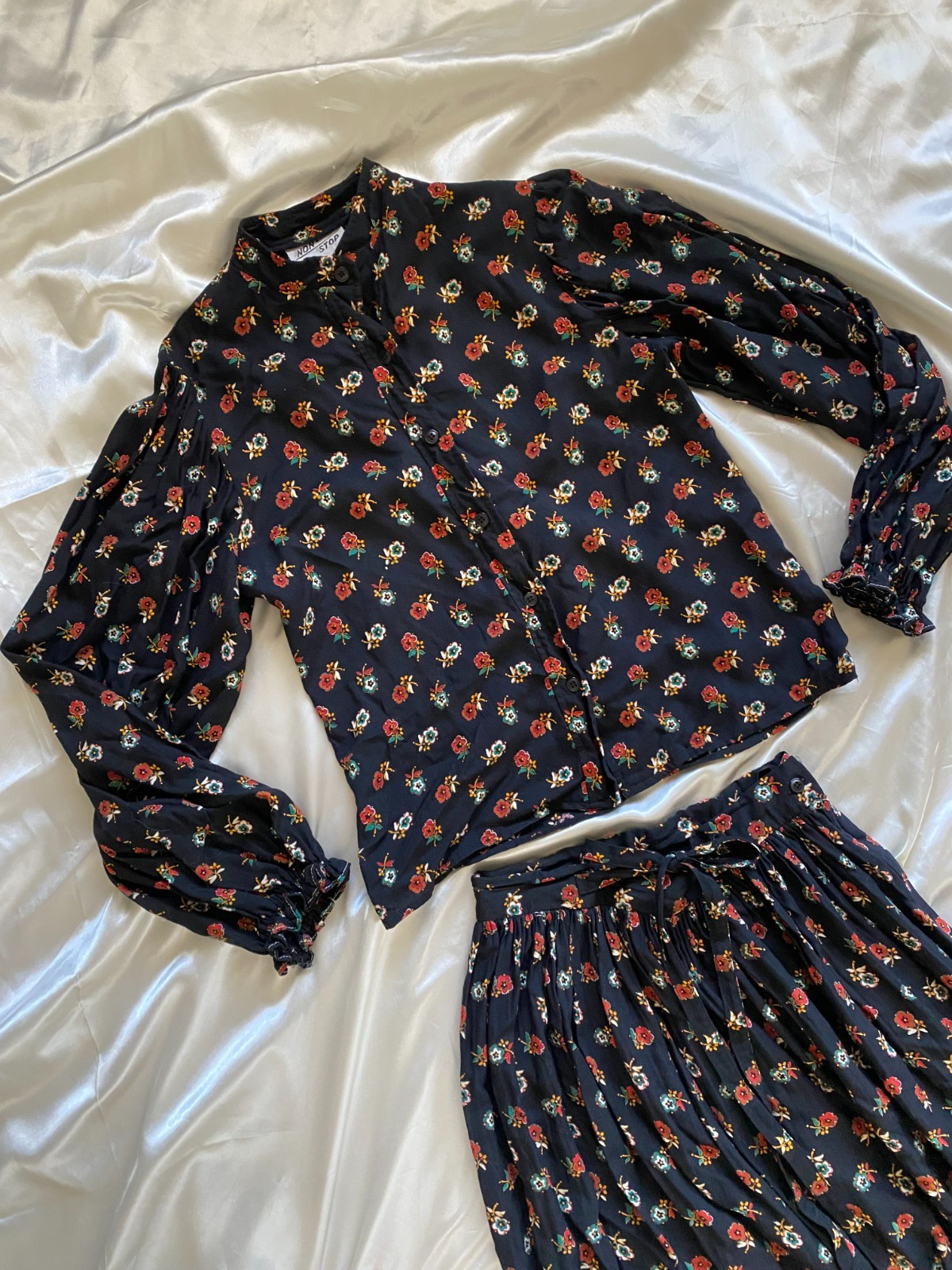 Vintage 1970s Black Floral Paisley Boho Puff Sleeve Skirt Set XS/S Peasant