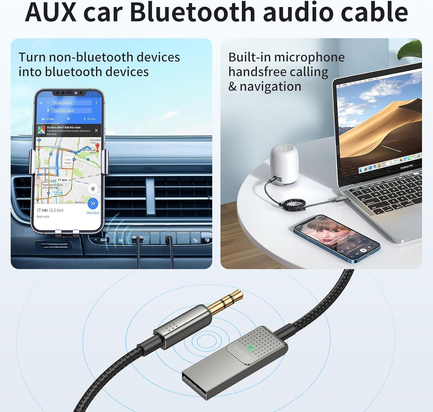 Aux Bluetooth Adapter 5.3 with Built-In Microphone CD Quality 10M Transmission B