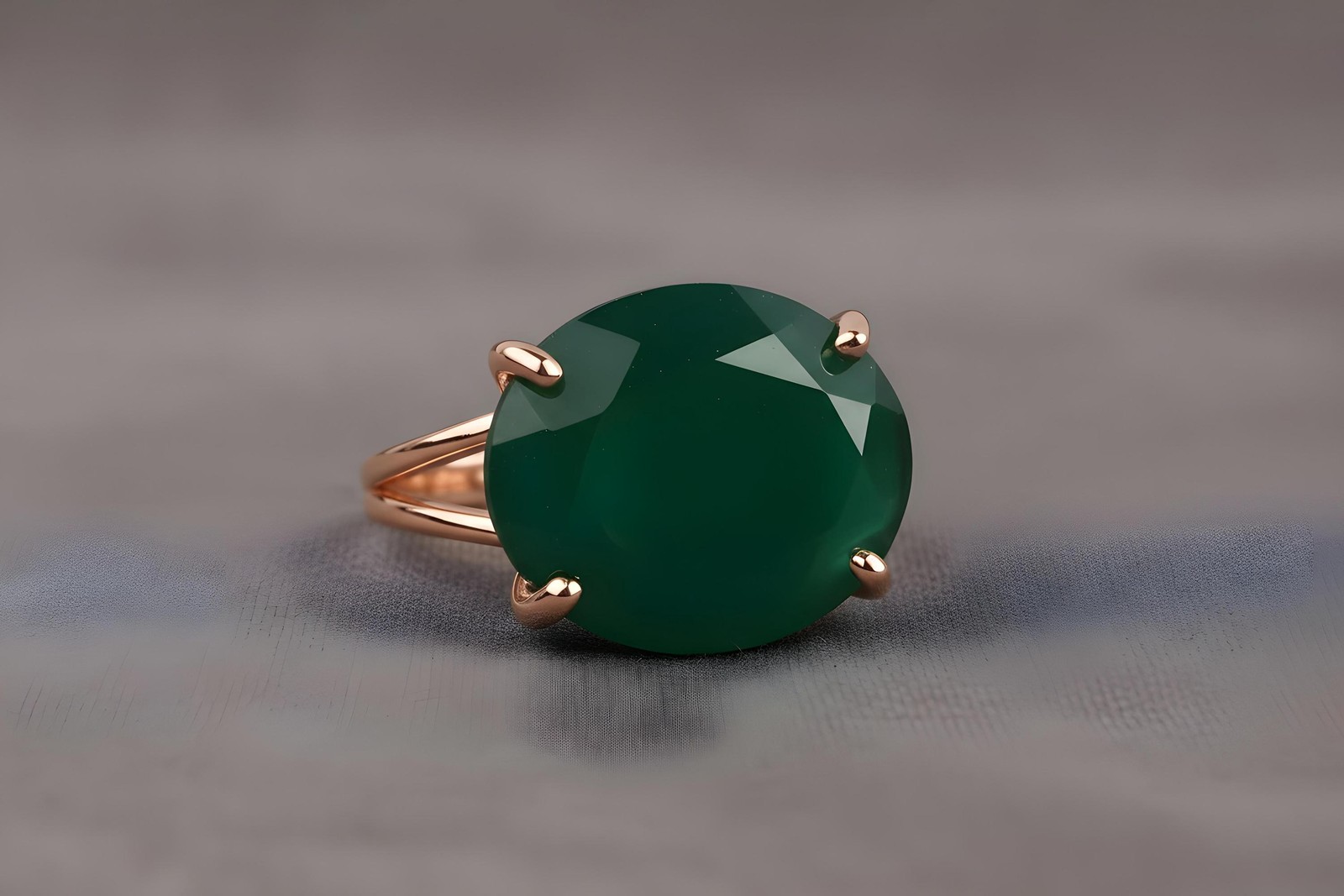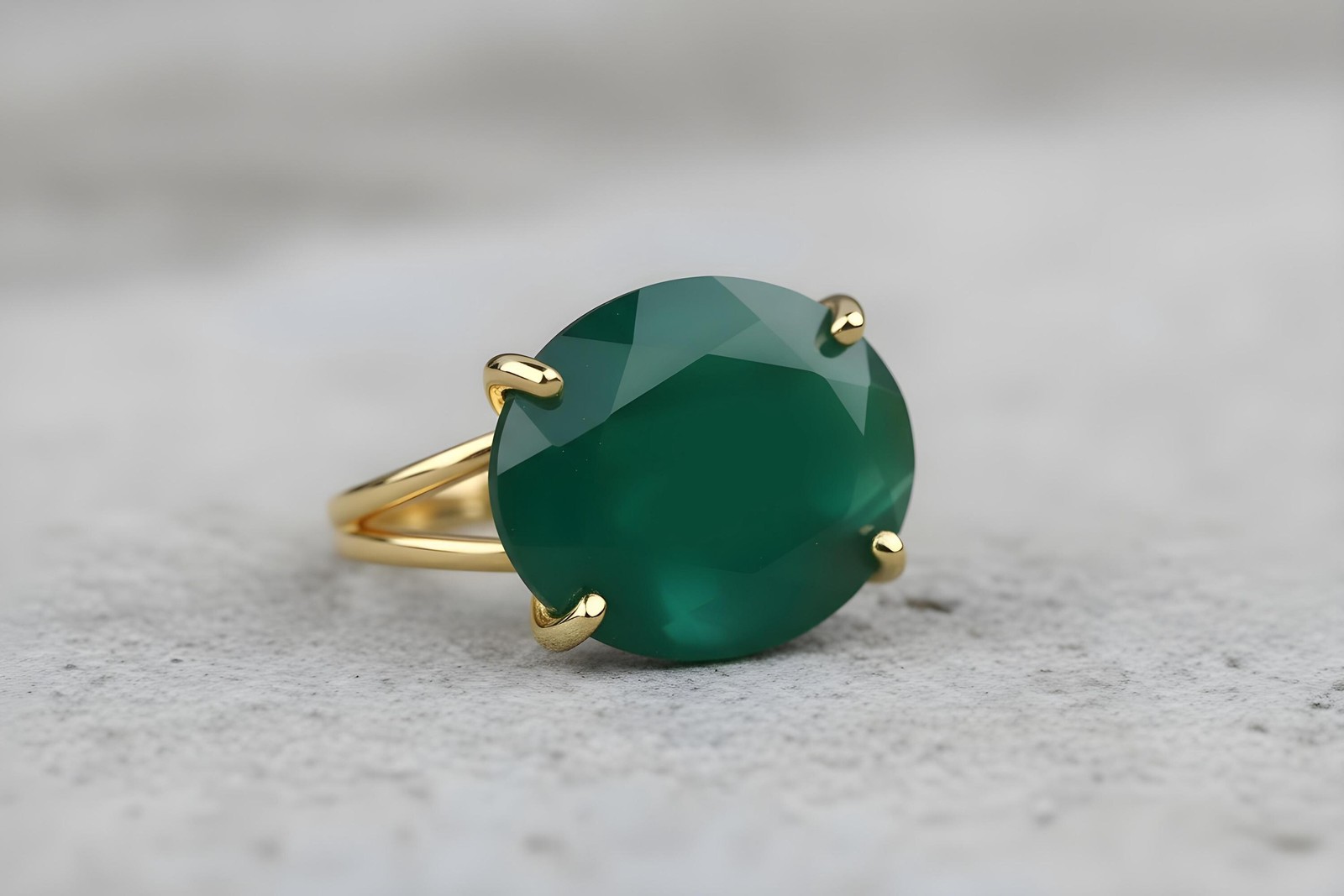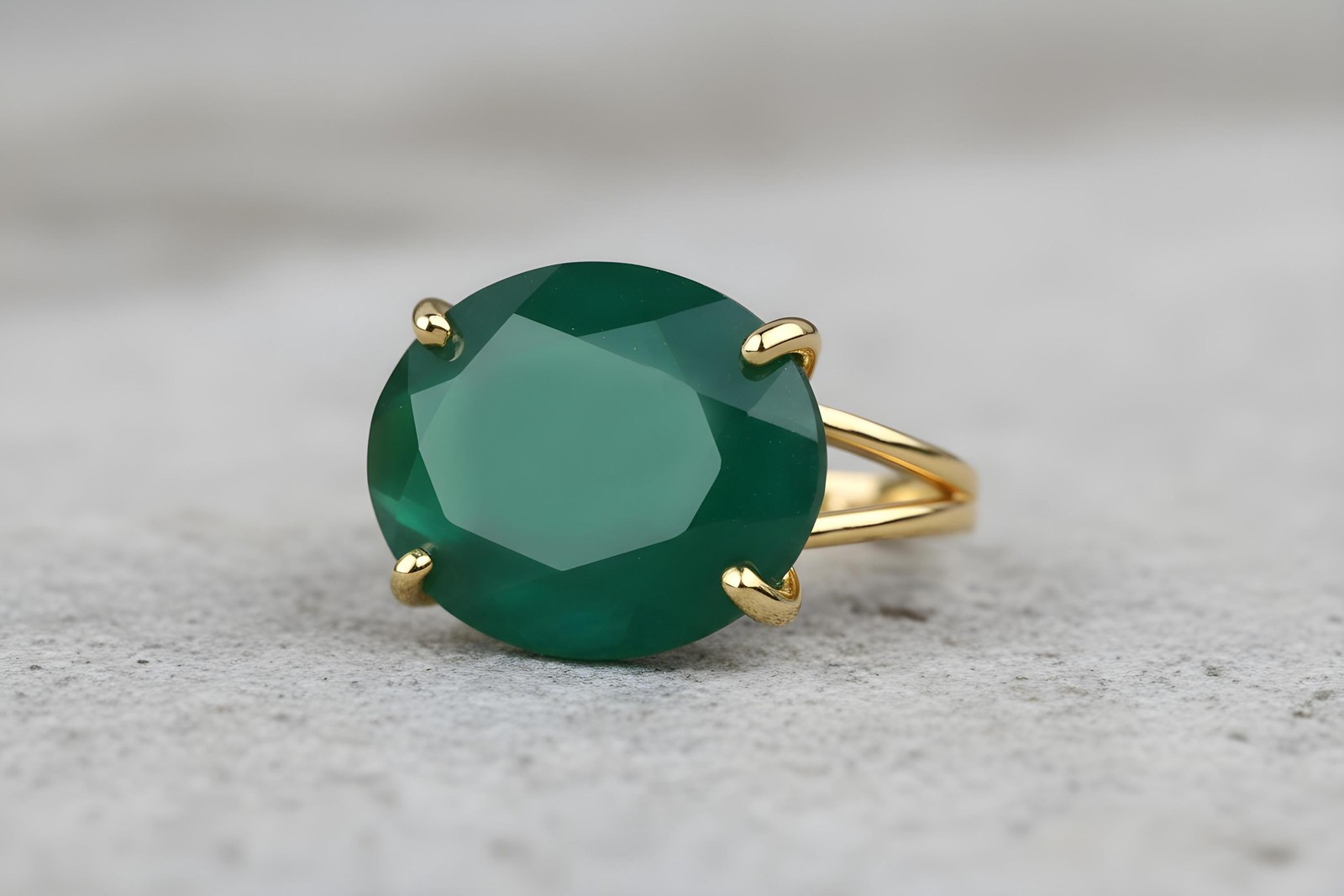 Green Onyx Ring Anemone Jewelry Large Oval Stone 14k Gold Cocktail