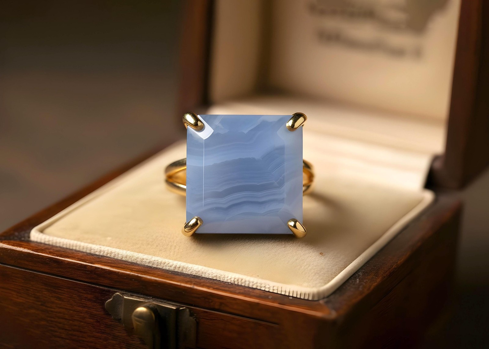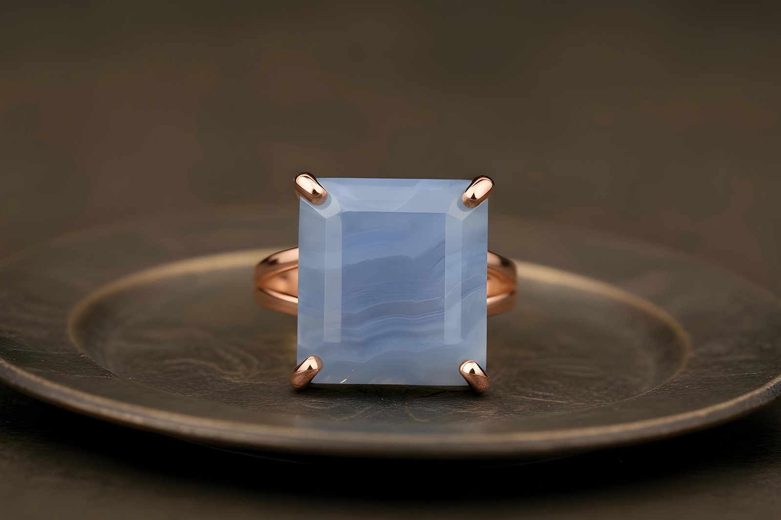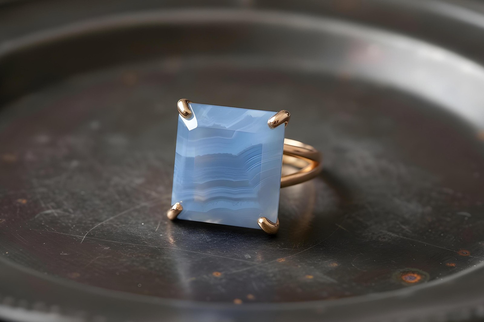 Blue Lace Agate Ring Anemone Handmade Square Cut 14k Gold Statement