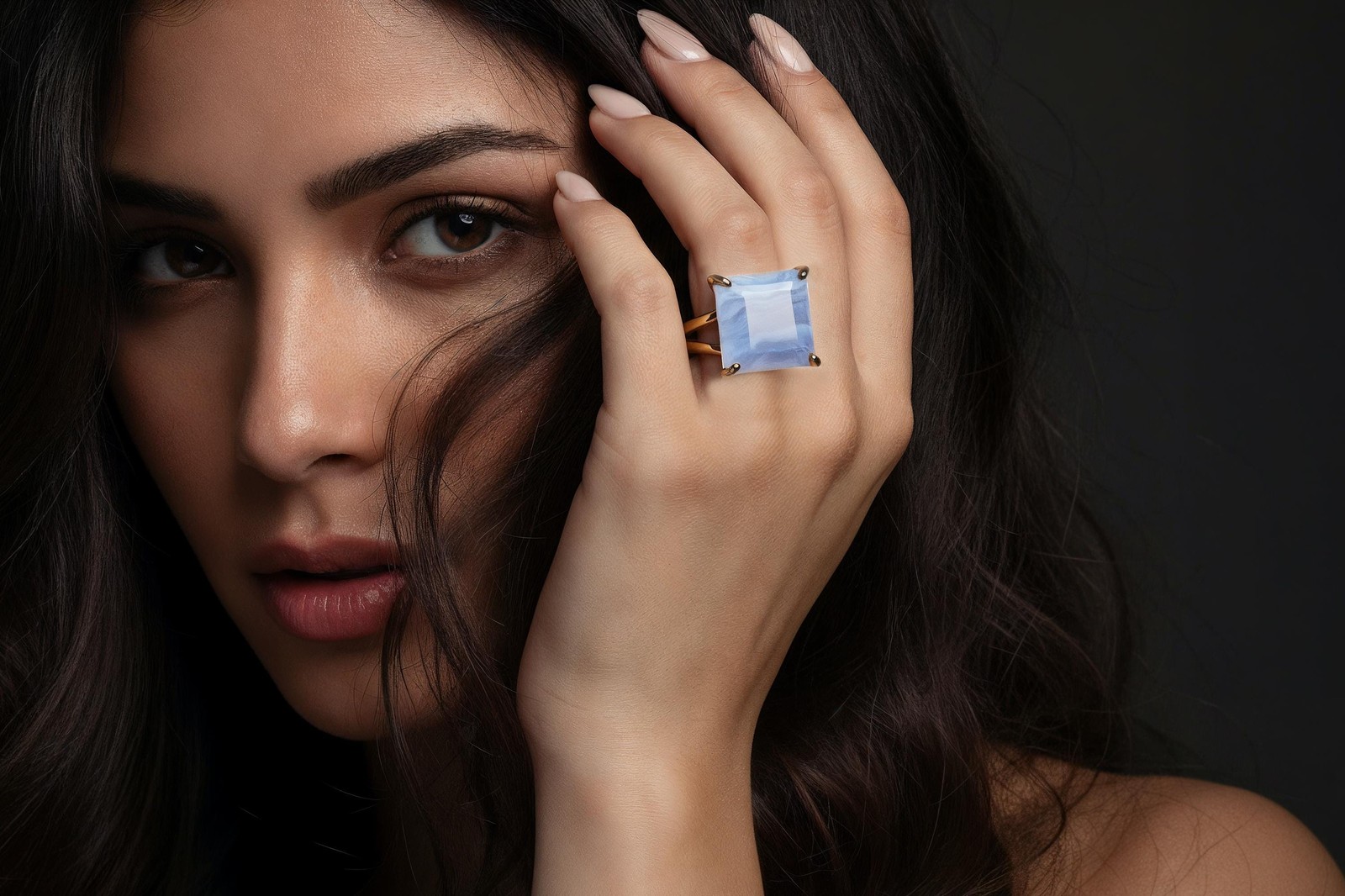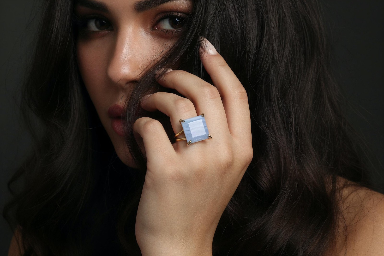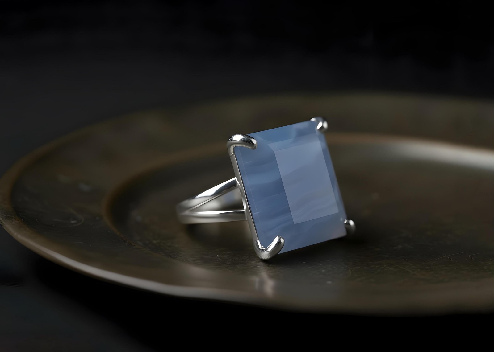 Blue Lace Agate Ring Anemone Handmade Square Cut 14k Gold Statement