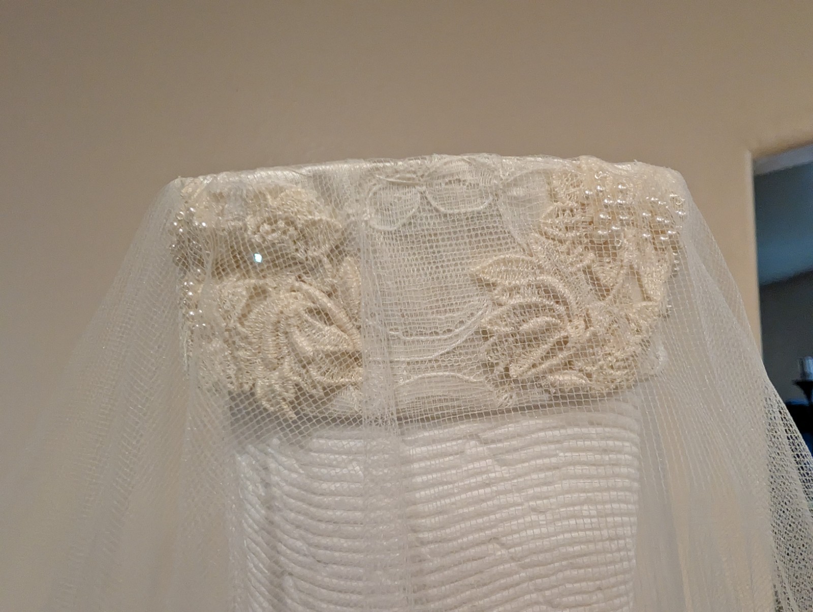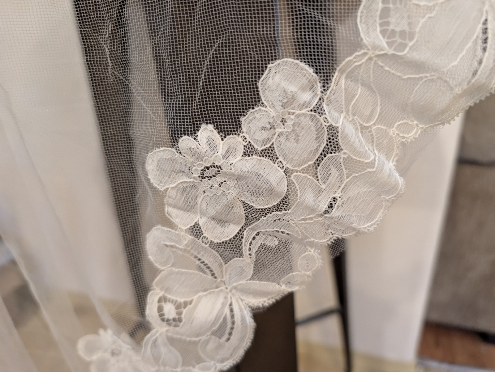 как выглядит Vintage Two Tier Crown Off White Lace Fingertip Length Veil фото