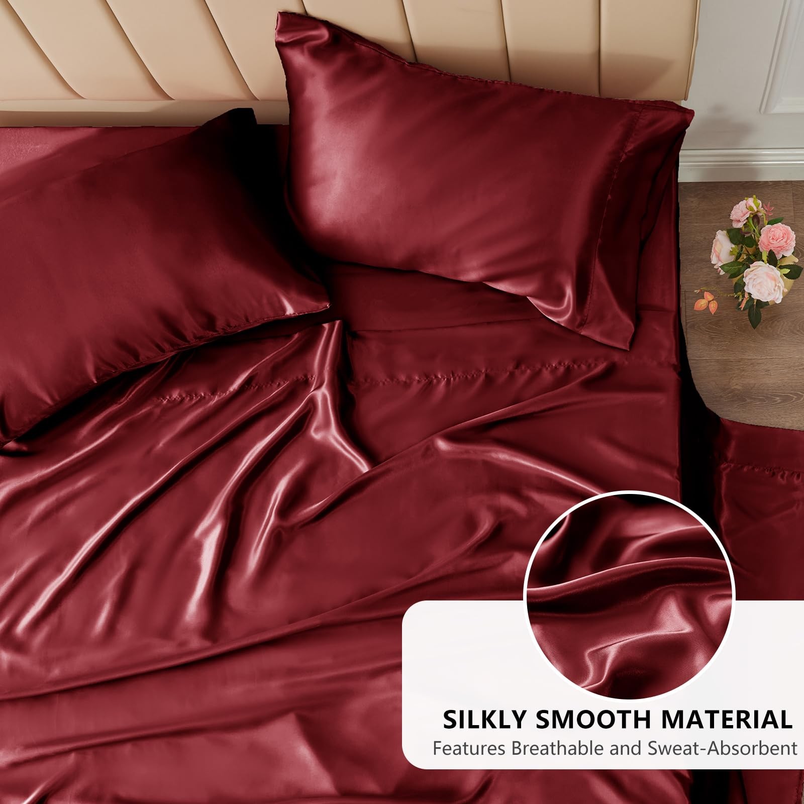 как выглядит Satin Sheets Queen Size Bed Set - 4 Piece Silky Queen Sheet Set, Luxury Burgu... фото