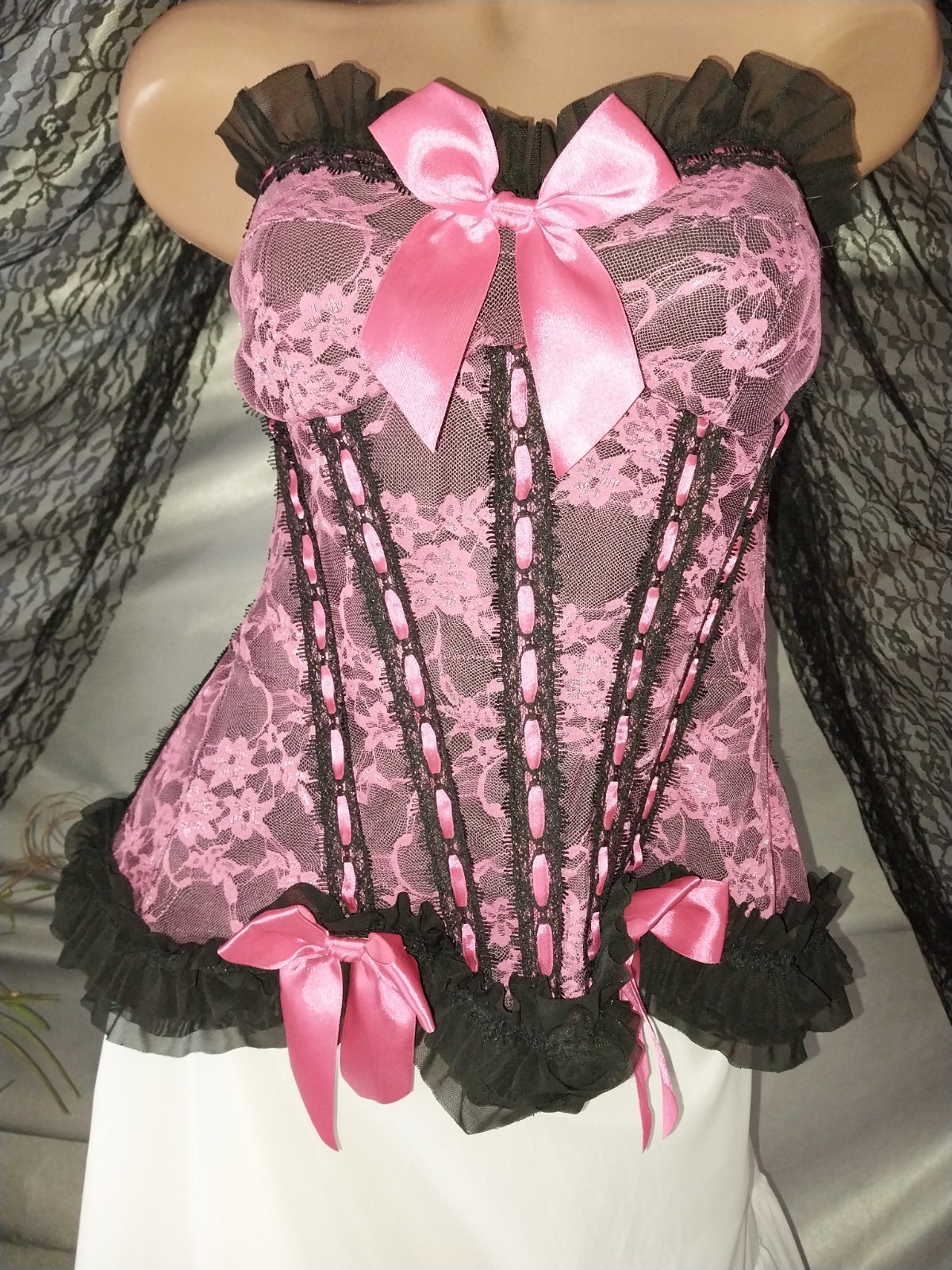 VTG SILKY SATIN LACY FRILLY HOT PINK BLACK CORSET BUSTIER Y2K COUETTE SISSY GLAM