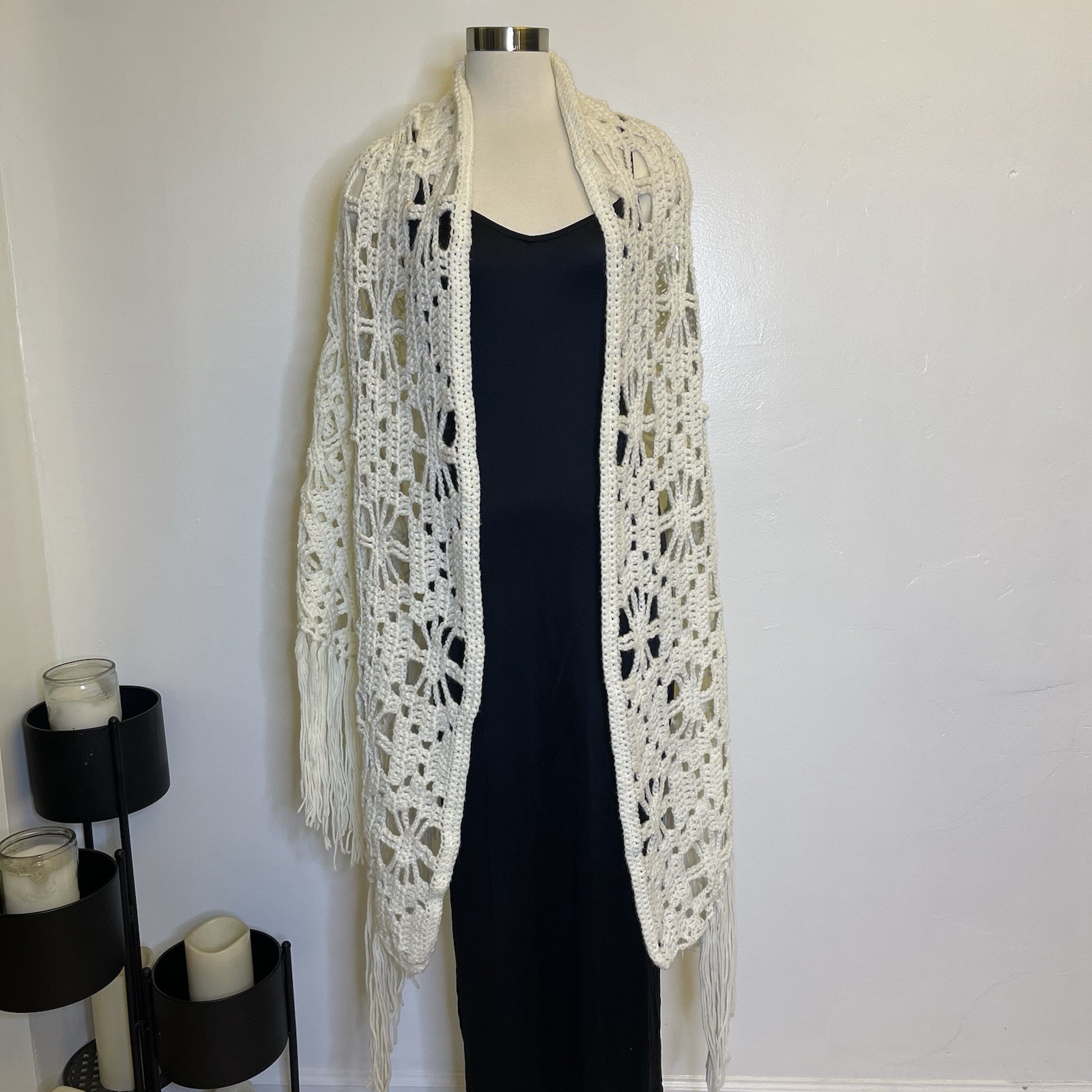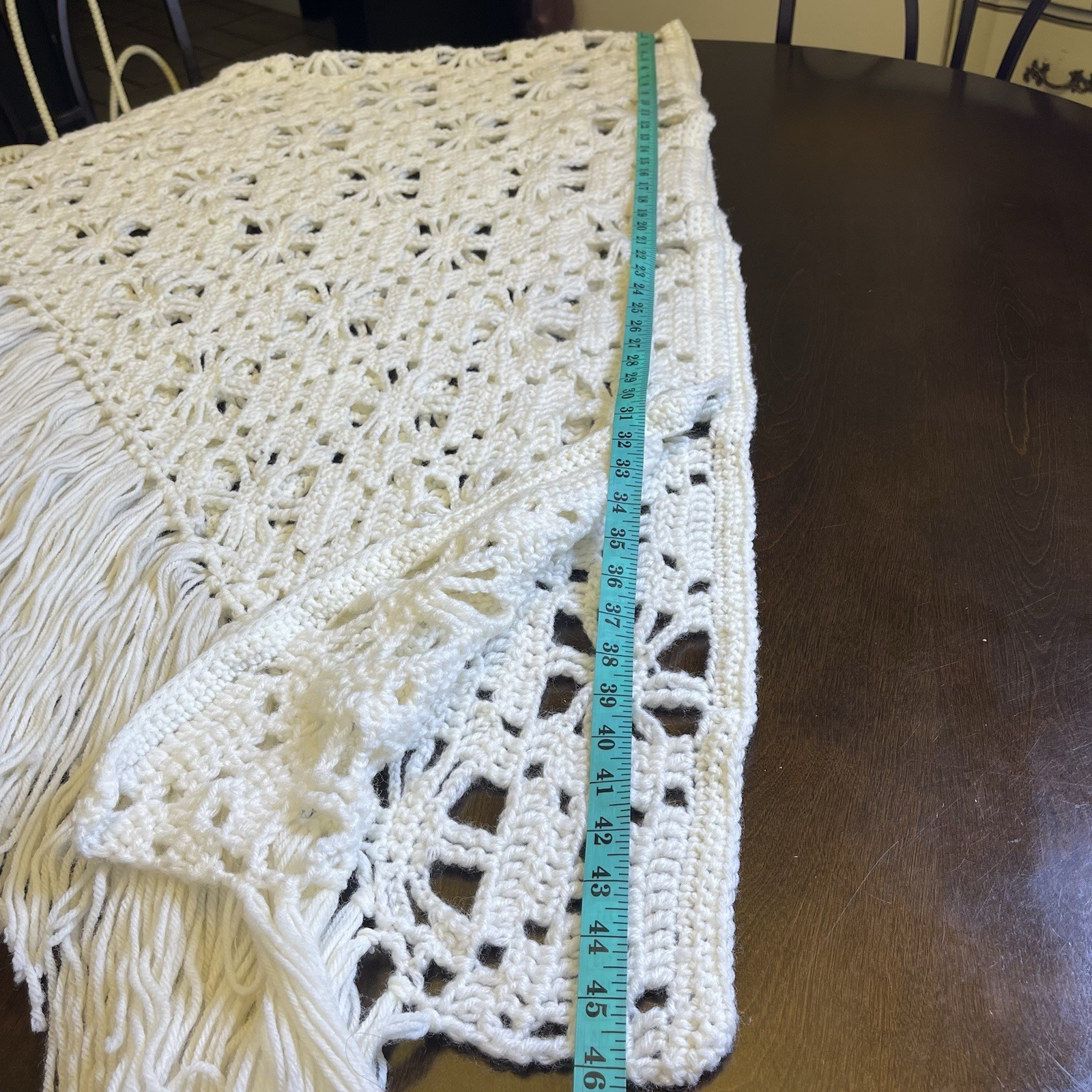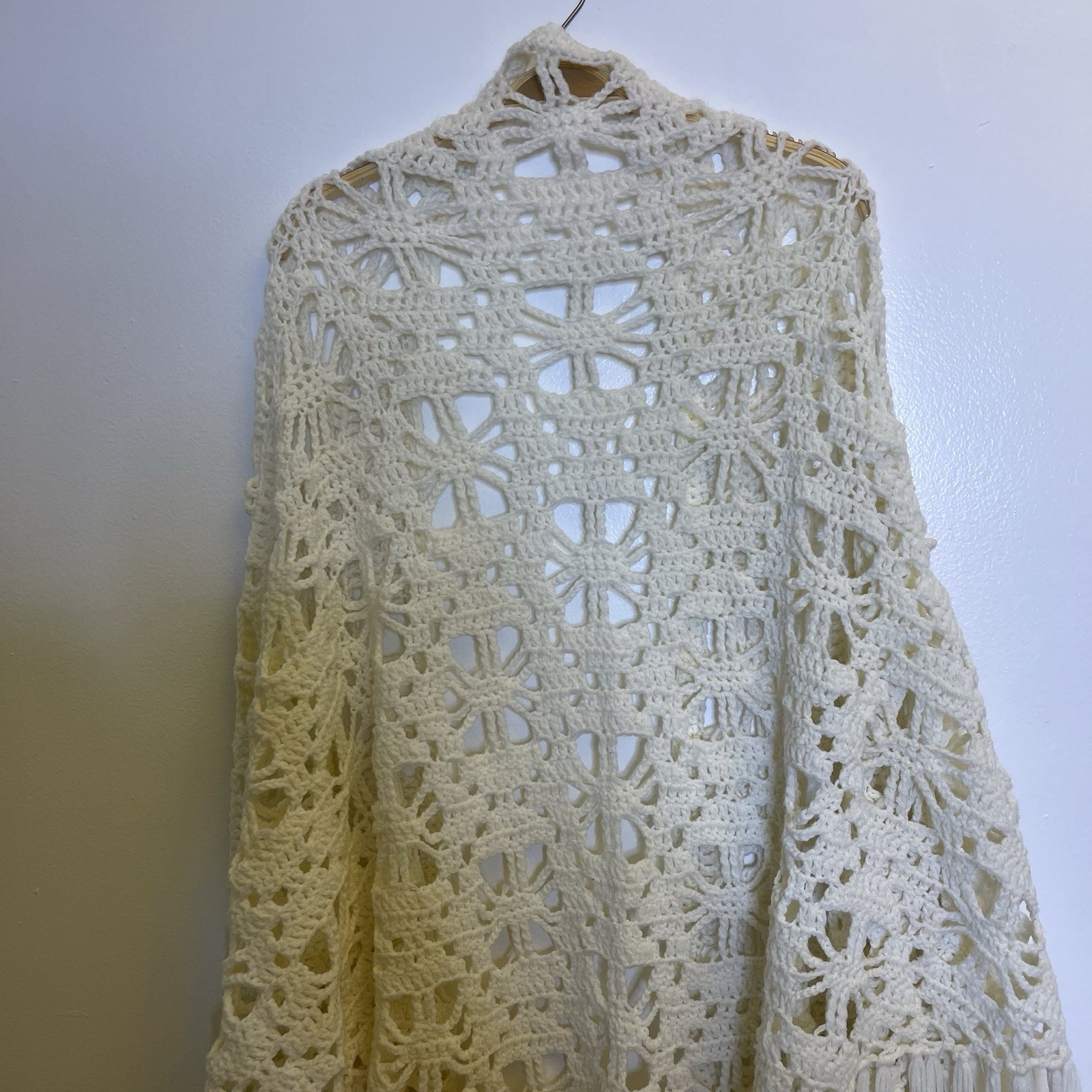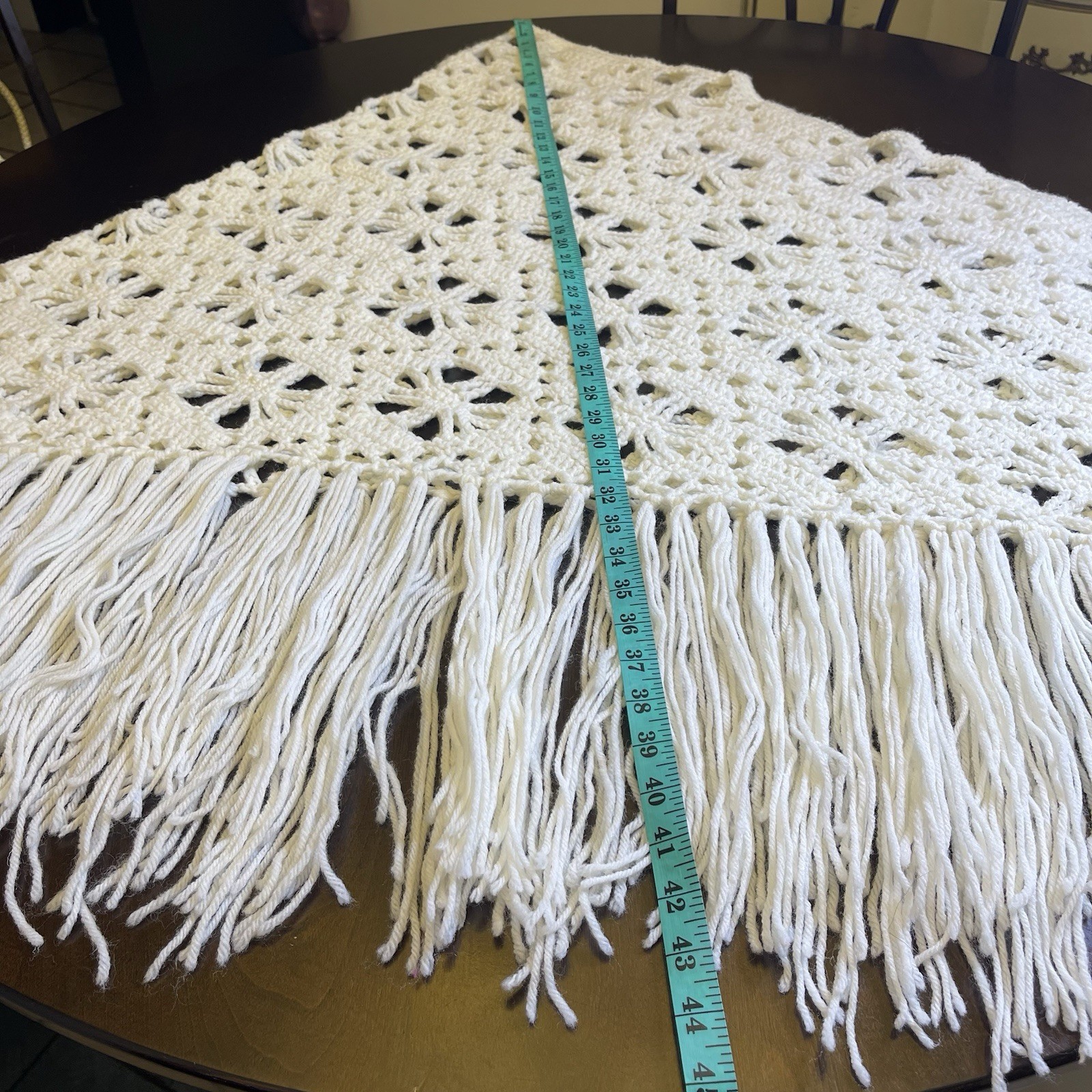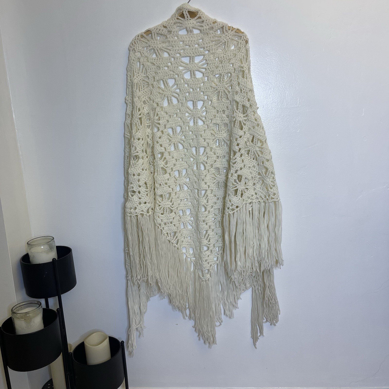 Handmade Vintage Women s Crochet Triangle Shawl Fringe Granny Cottage Boho Cream