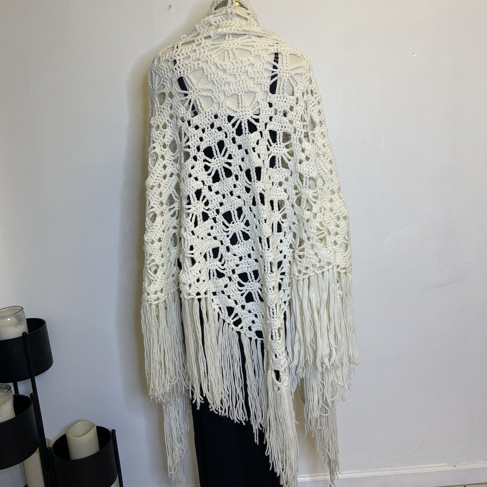 как выглядит Handmade Vintage Women s Crochet Triangle Shawl Fringe Granny Cottage Boho Cream фото