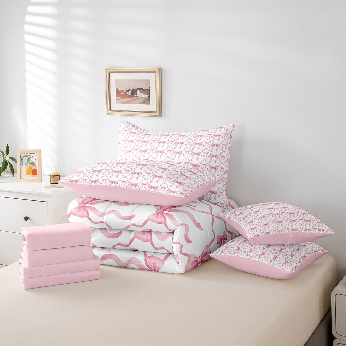 Pink Bow Queen Comforter Set for Teen ,Cute Ribbon Bowknot Bed in A Bag with ...