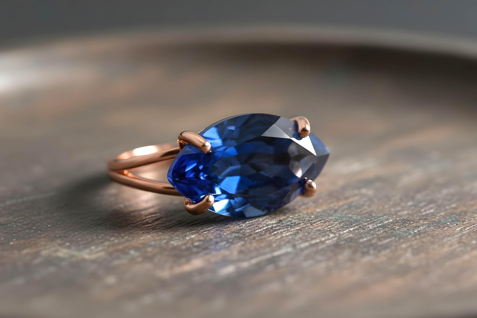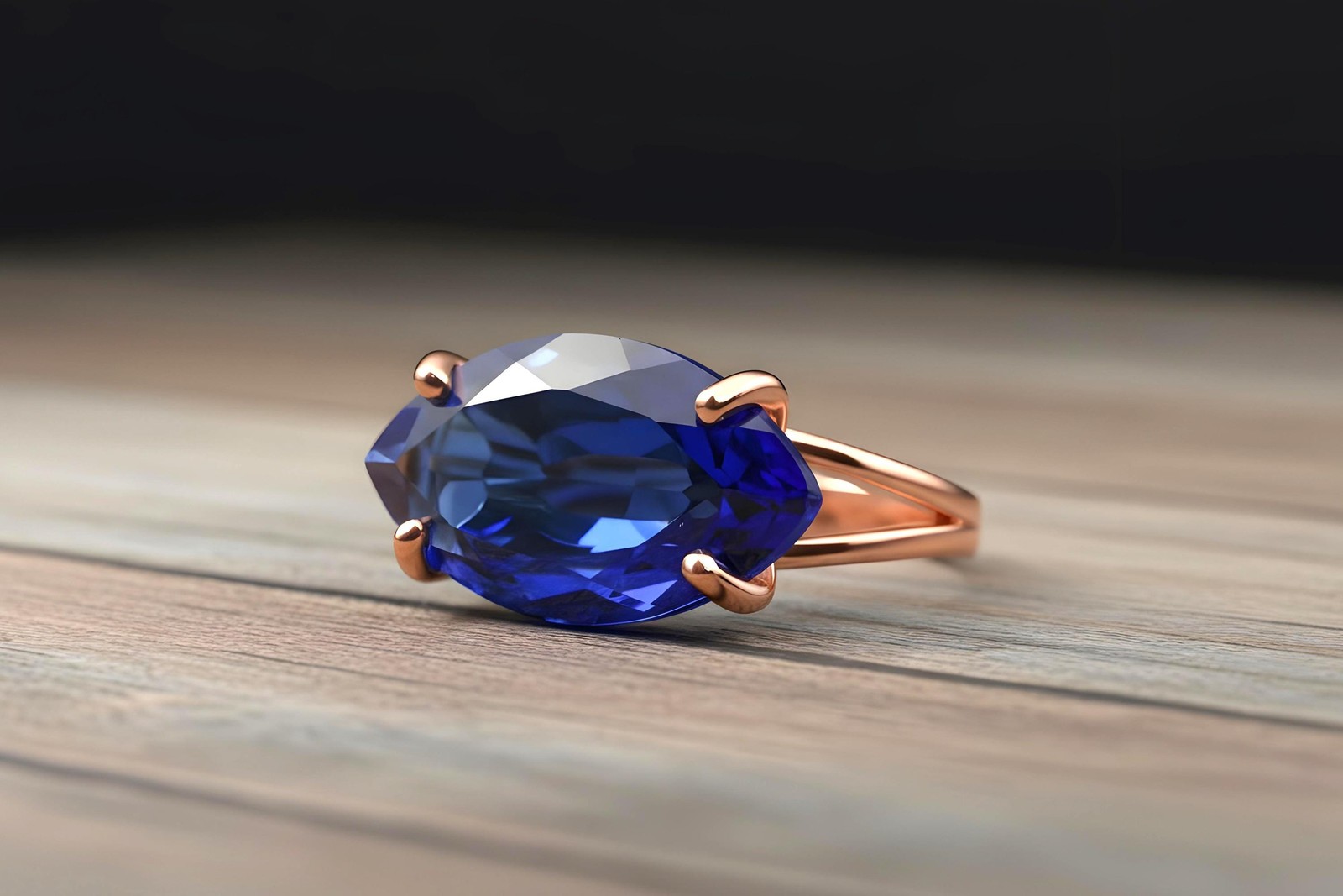 как выглядит Gold Sapphire Ring Anemone Jewelry Marquise Cut Deep Blue Handmade фото