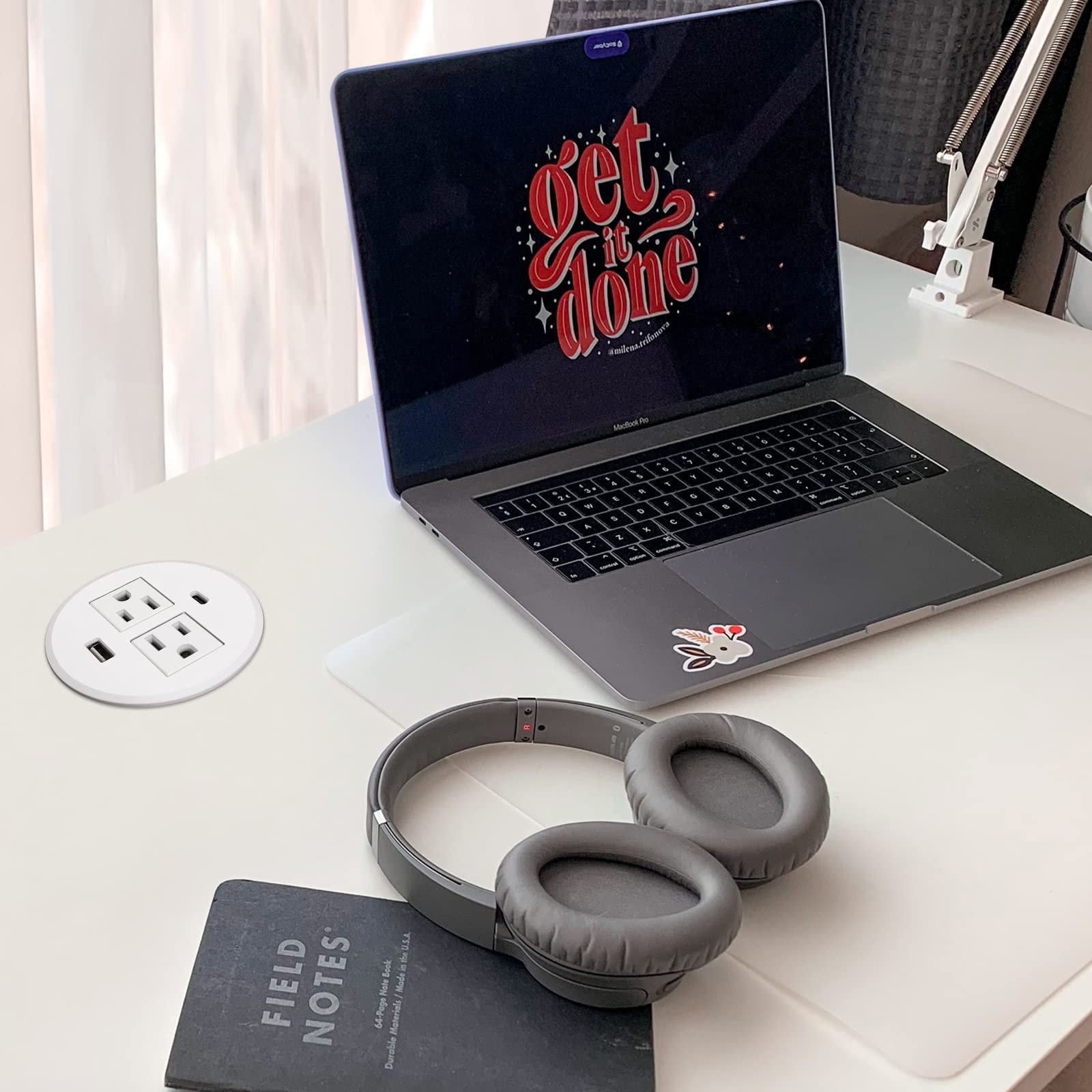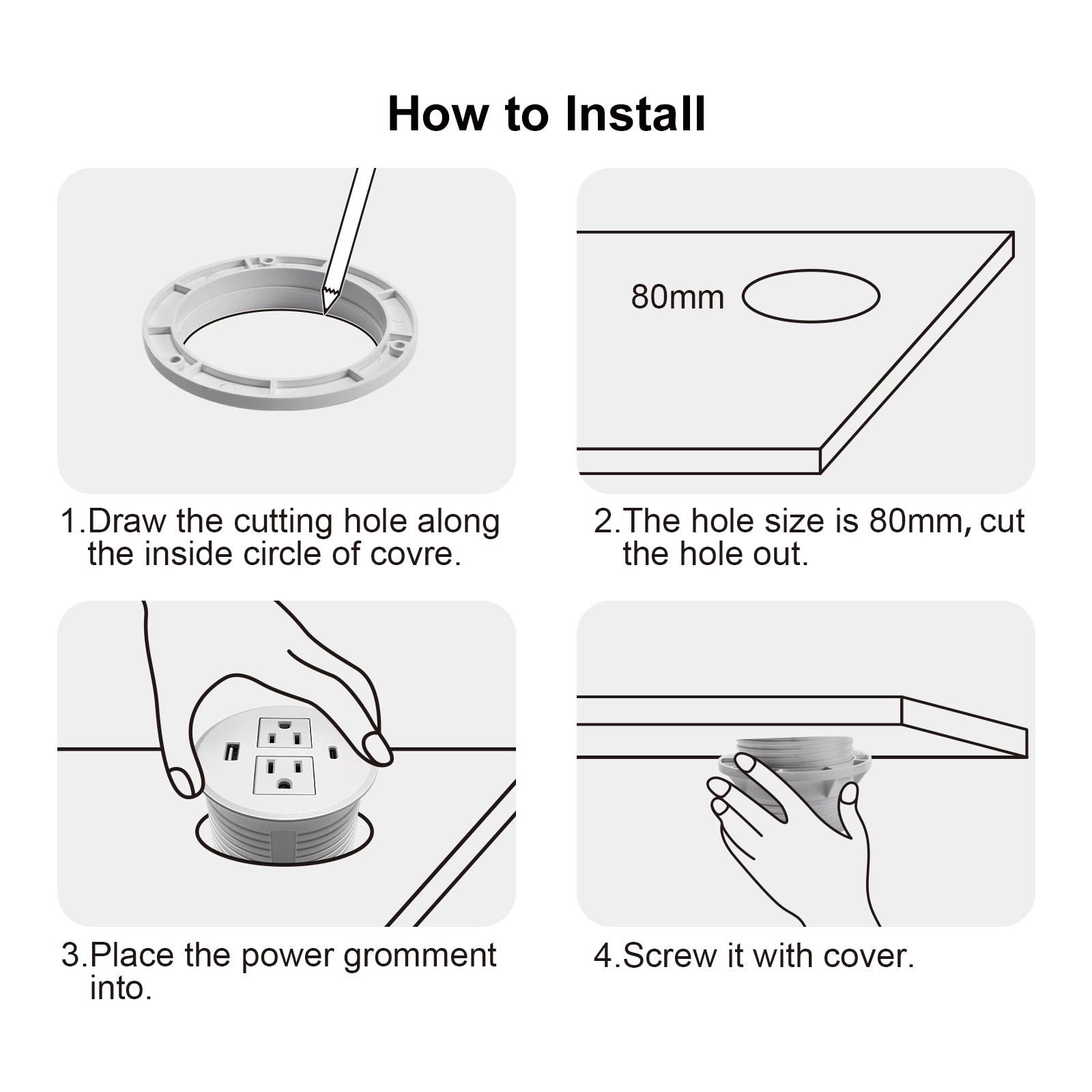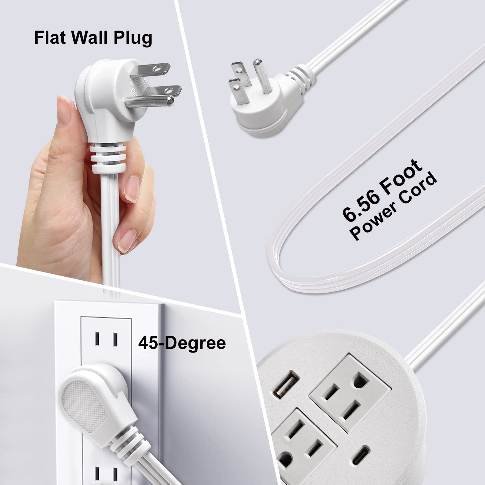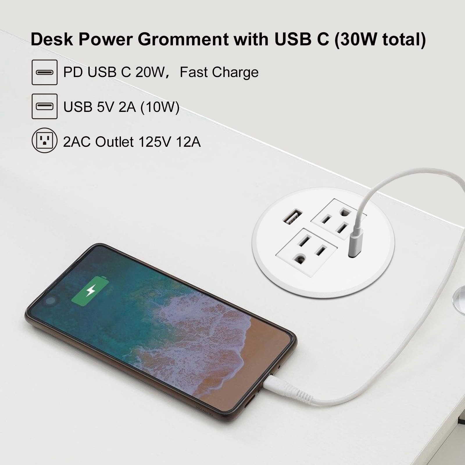 Desk Power Grommet USB C 30W PD Fast Charge 2 Outlets 2 USB Recessed White