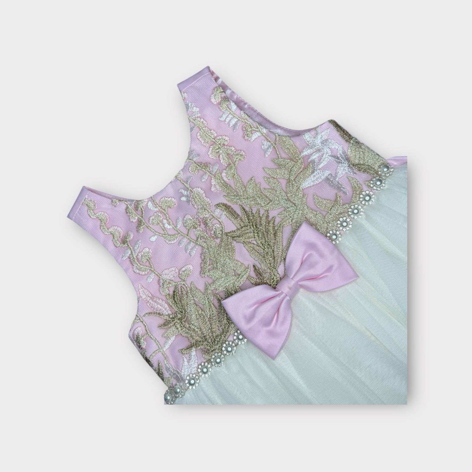 как выглядит American Princess Pink Bodice Gold Jacquard White Tulle Tiered Dress NWOT фото
