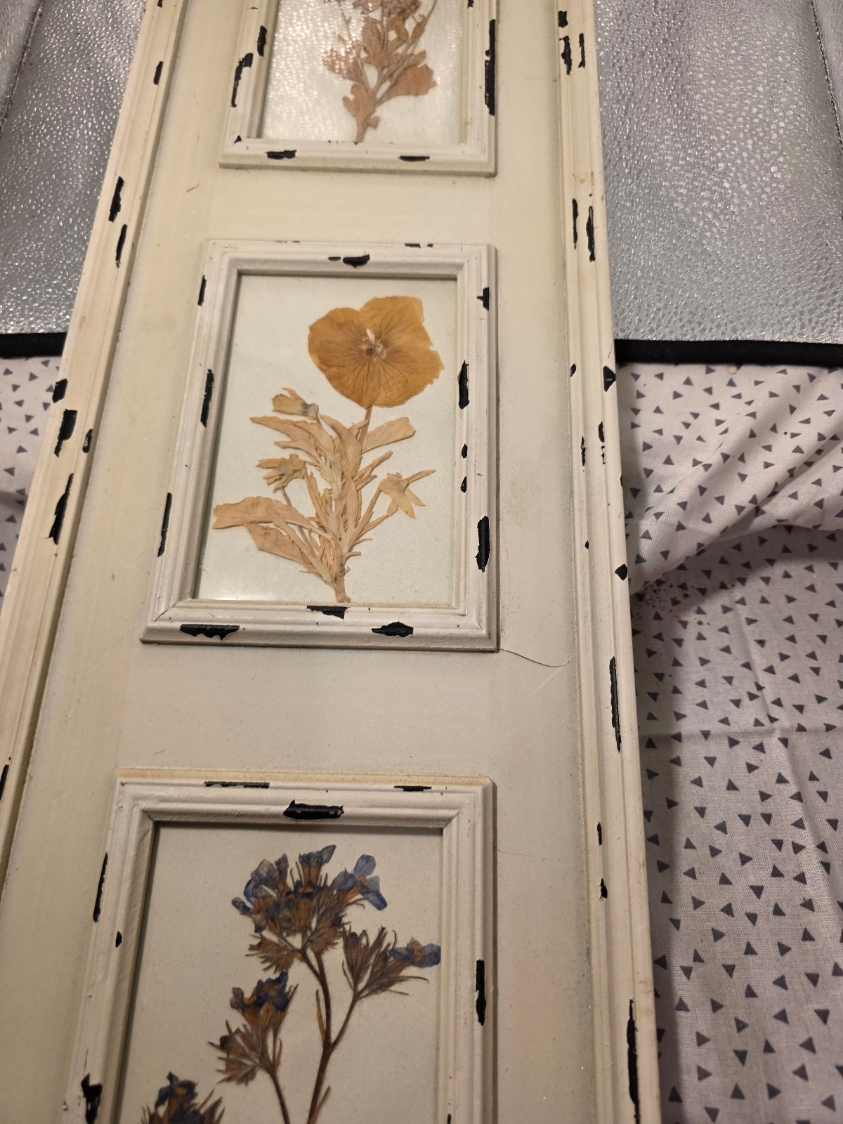 как выглядит distressed white wooden frame featuring preserved pressed flowers фото