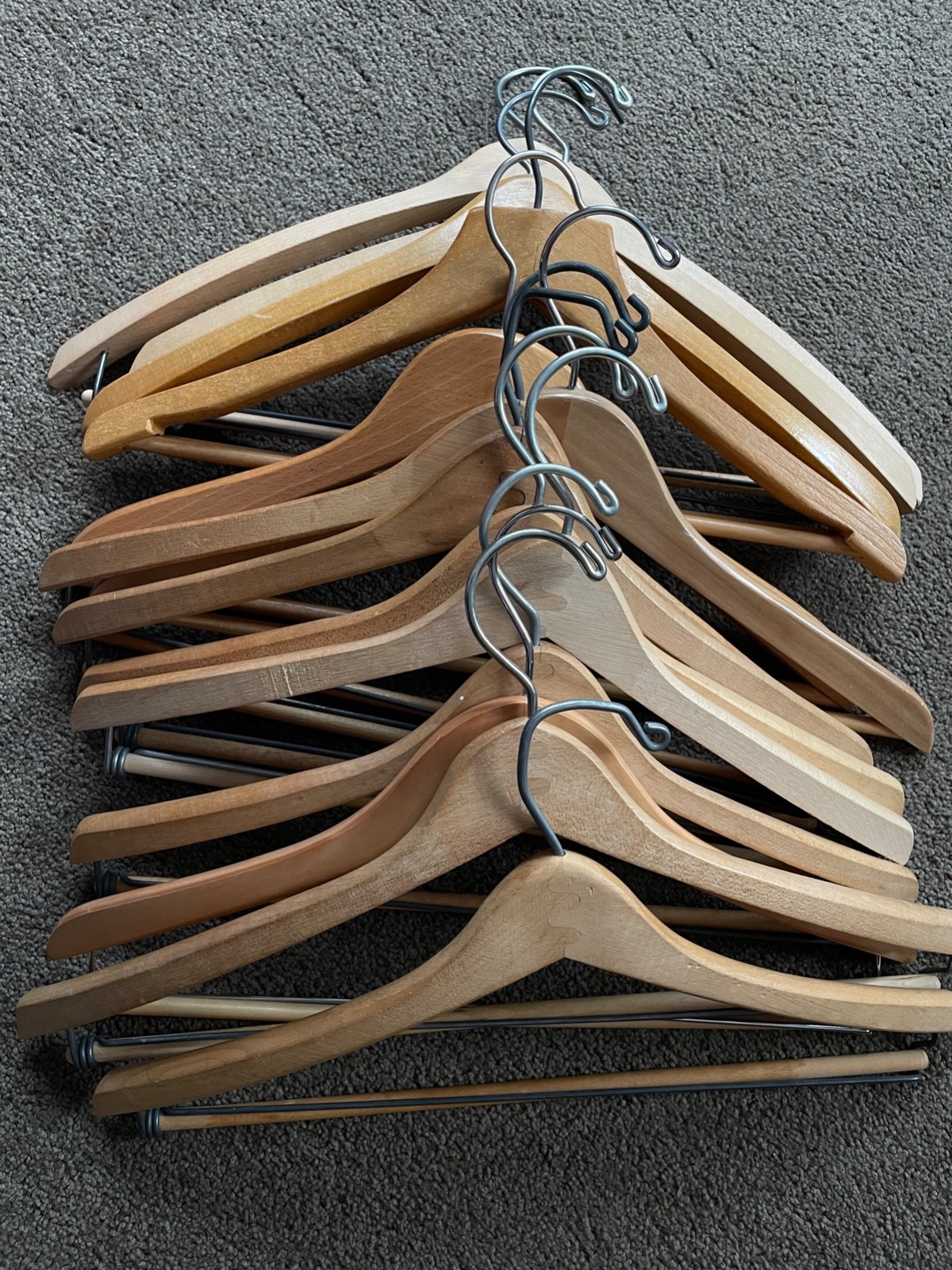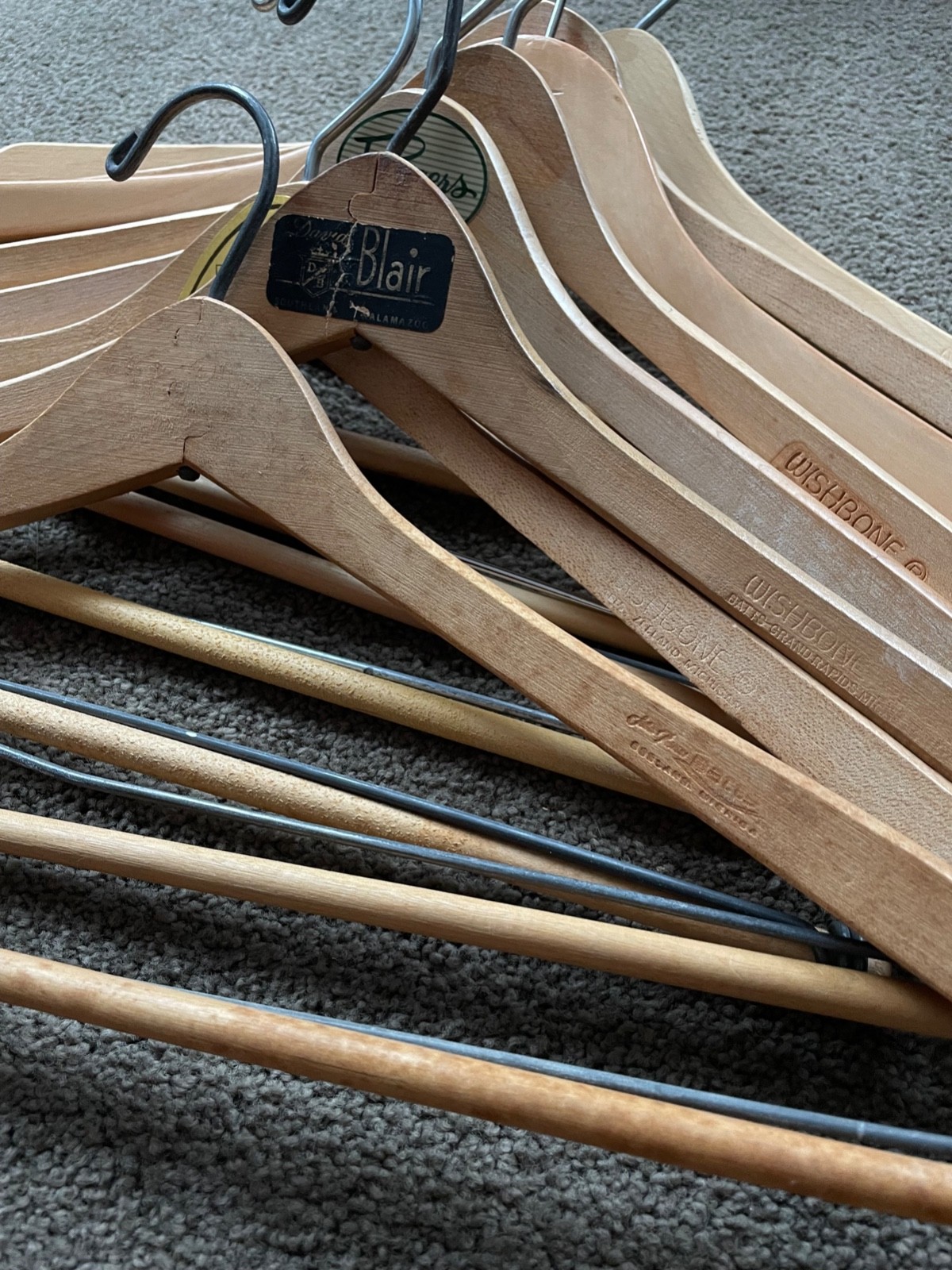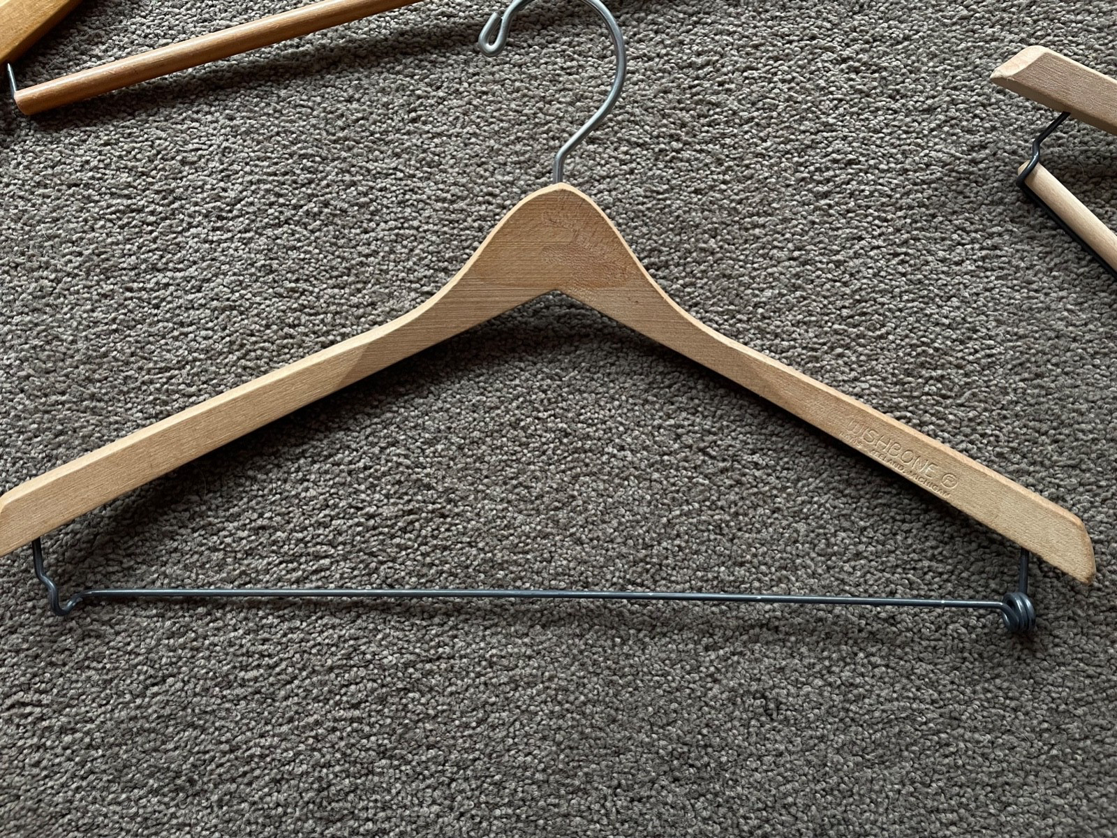 Mixed lot 14 Wooden Hangers Pants Suit Coat trousers vtg some ads Wishbone/batts