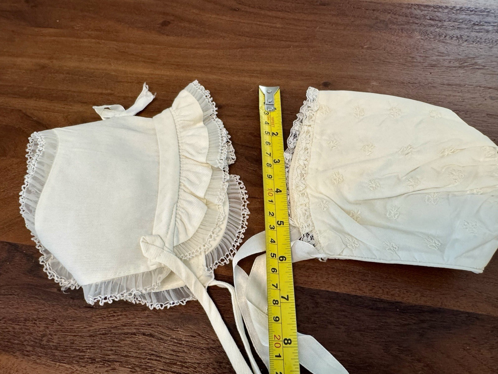 2 Vintage Handmade Baby Bonnets w/ ties Ivory Infant Christening 1960s Doll Hats