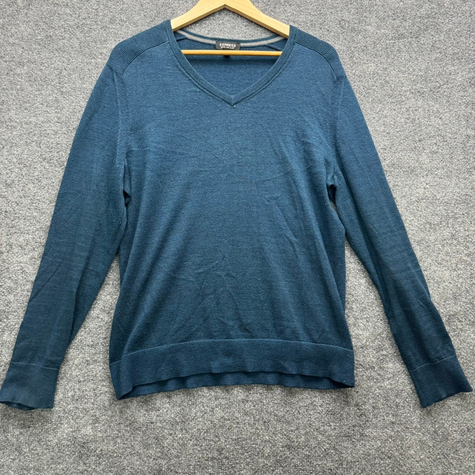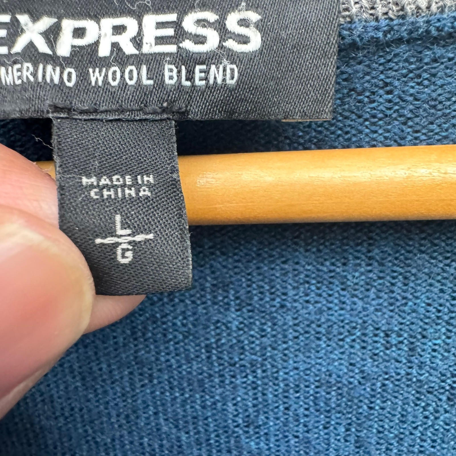 Express V-Neck Sweater Men's Size L Blue Merino Wool Blend Long Sleeve Pullover