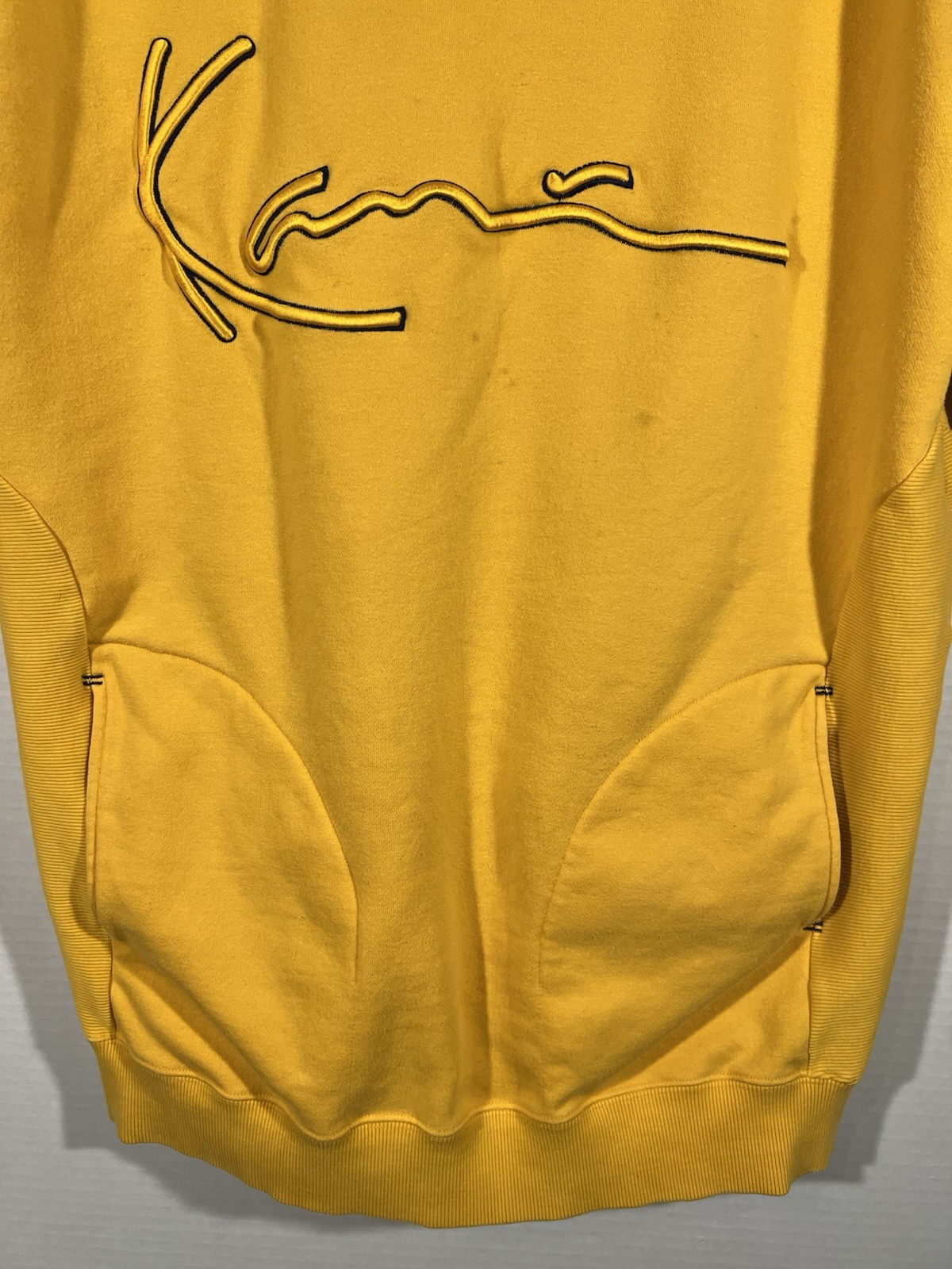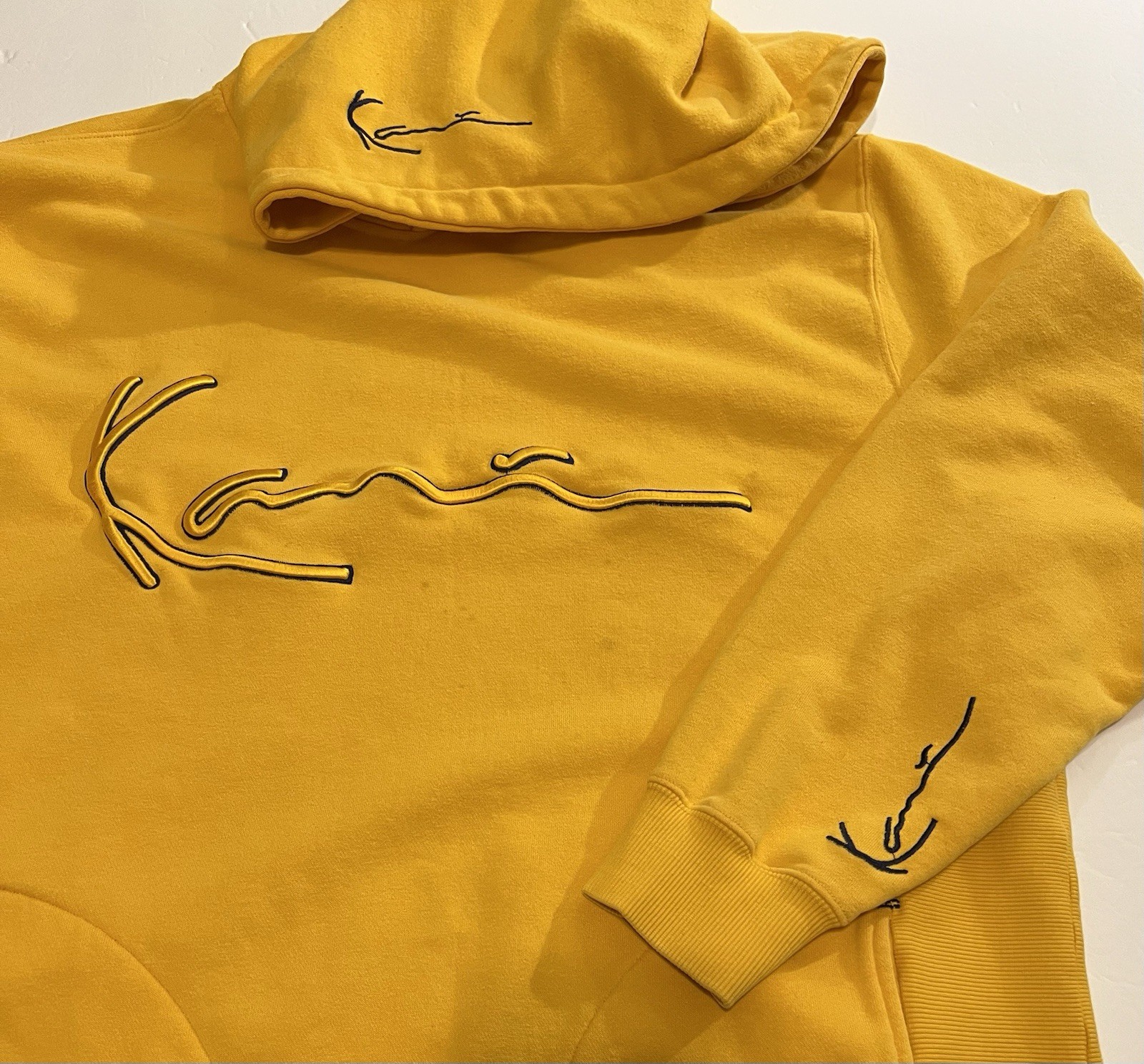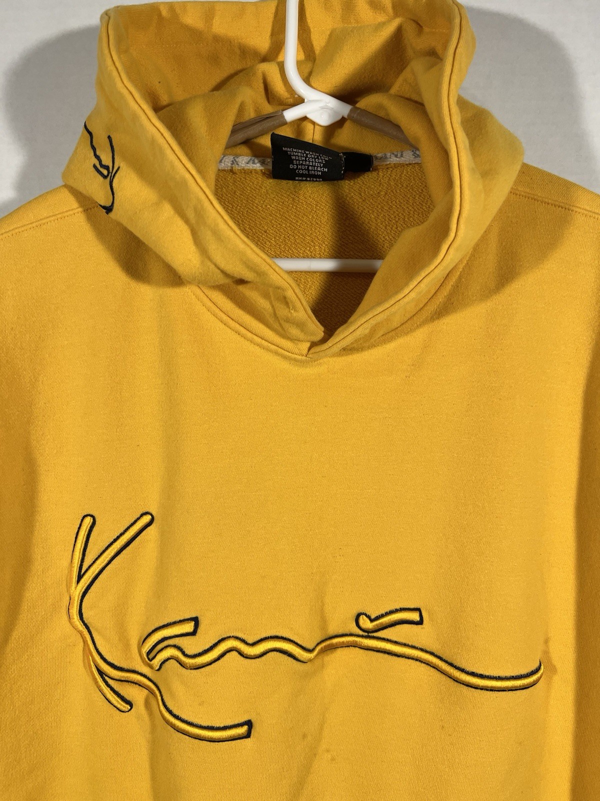 как выглядит VTG Karl Kani Jeans Signature Patch Hoodie Yellow Mens Sz L STREETWEAR HIP HOP фото