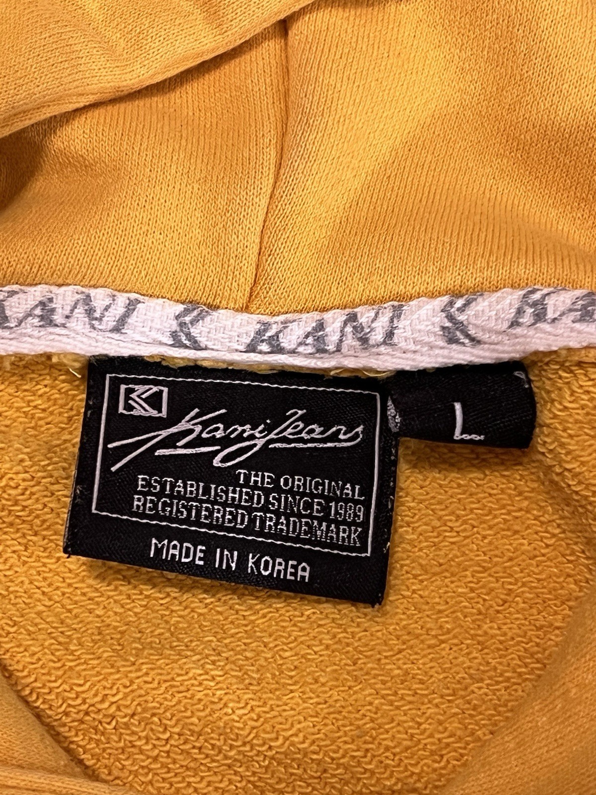 VTG Karl Kani Jeans Signature Patch Hoodie Yellow Mens Sz L STREETWEAR HIP HOP