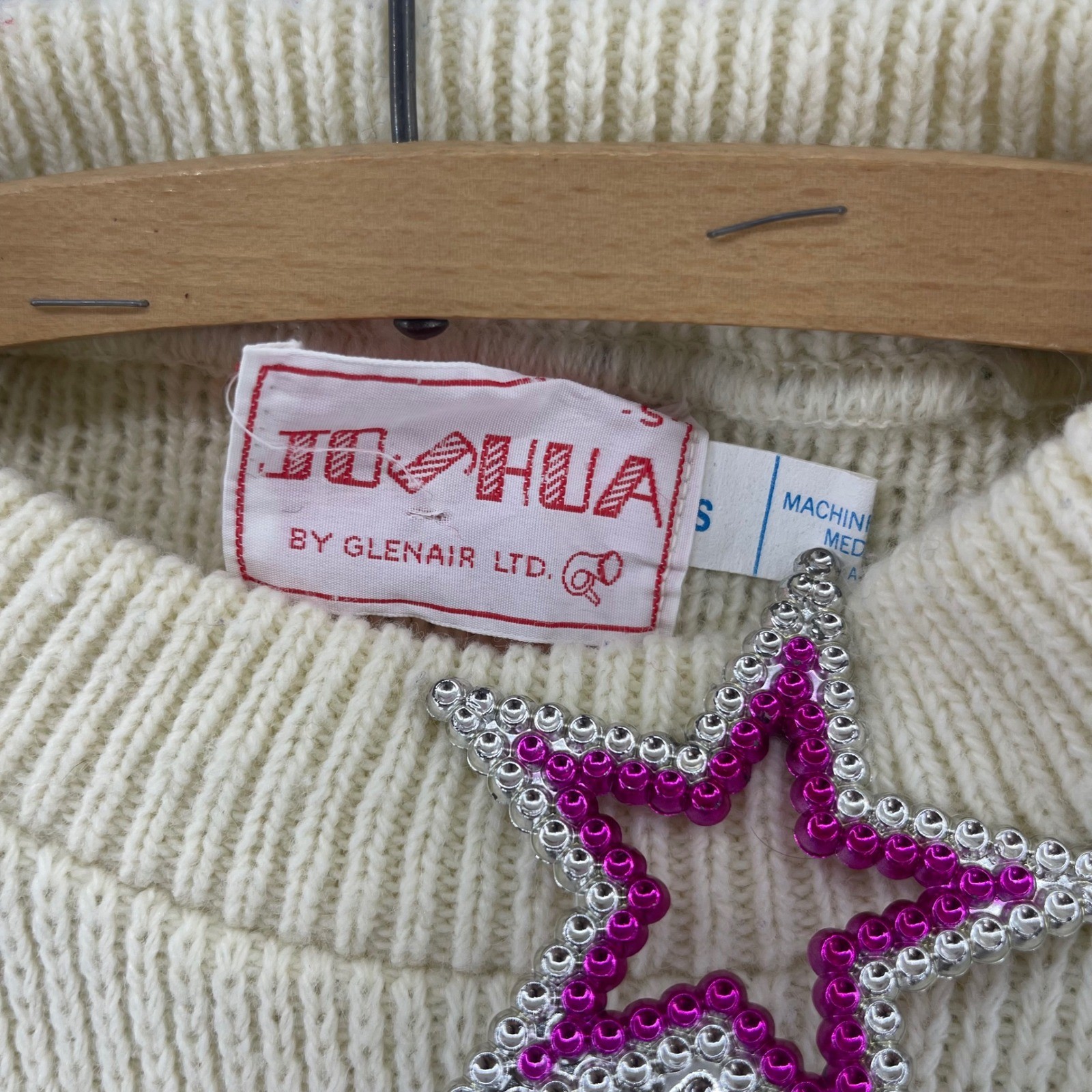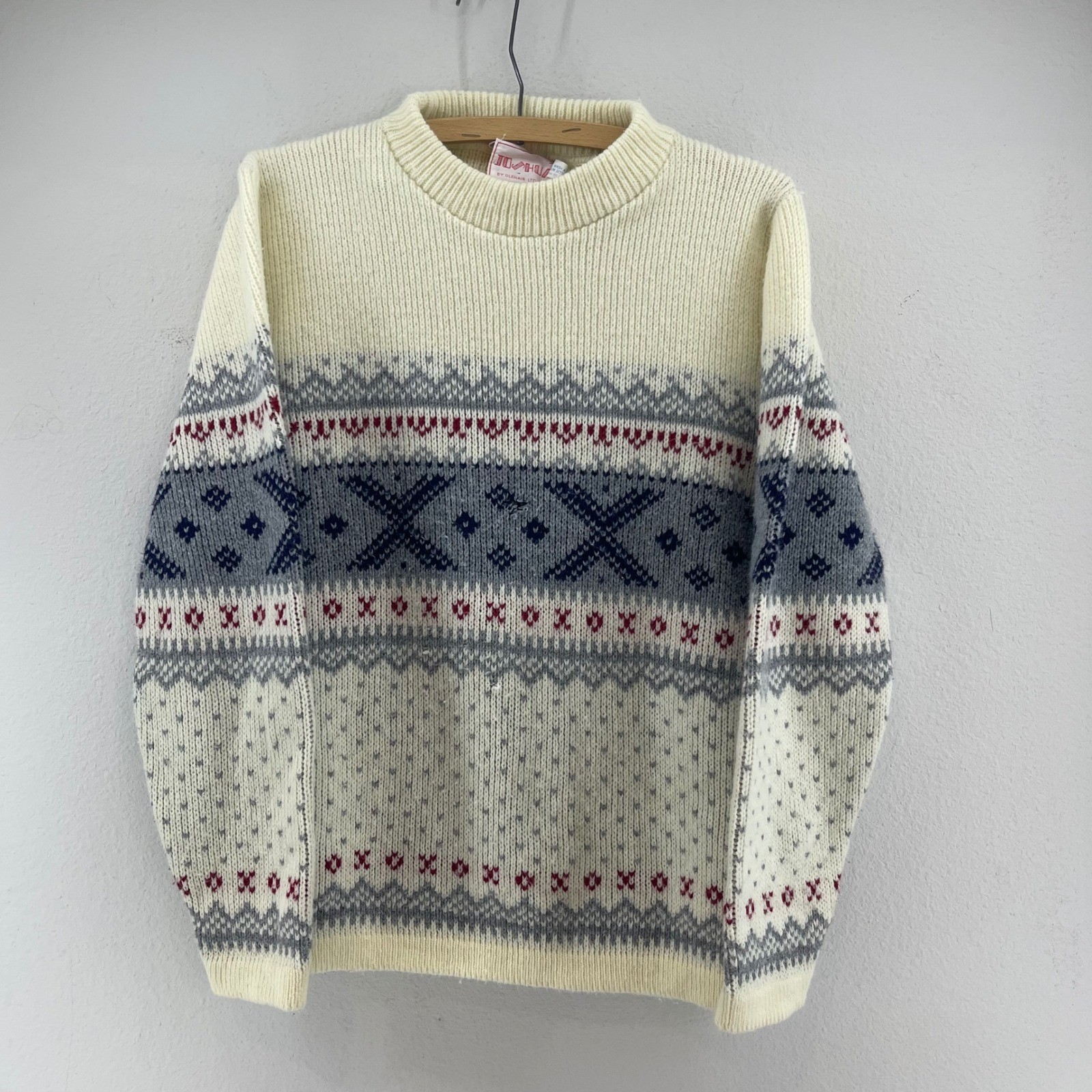 Vintage Fair Isle Knit Sweater M Cream Navy Red Apres Ski