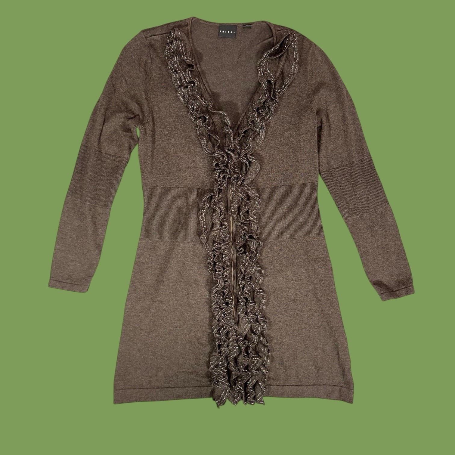 VTG KNIT GLITTER RUFFLE DRESS SWEATER DUSTER JACKET HIPPY WHIMSICAL FOREST FAIRY