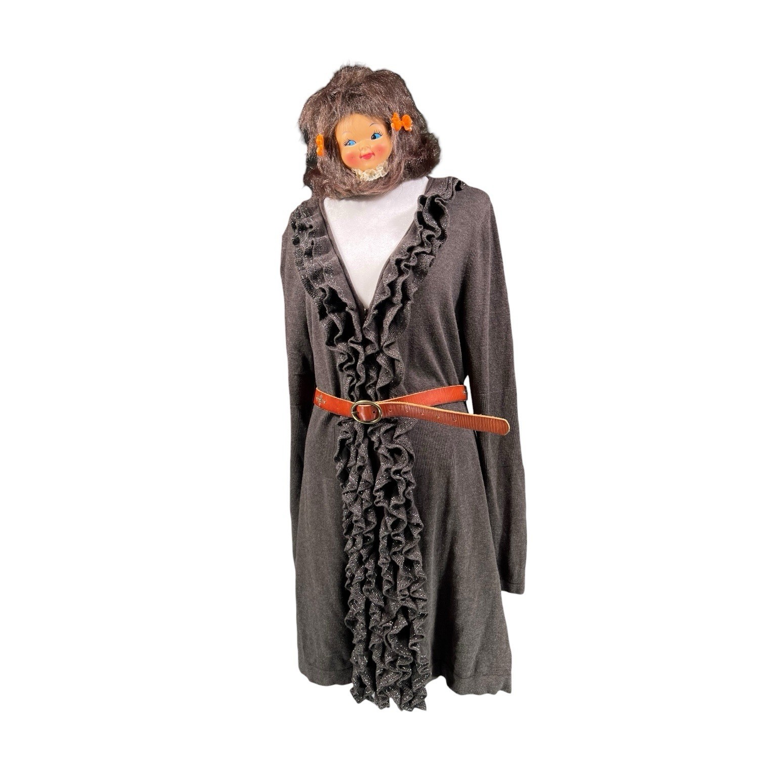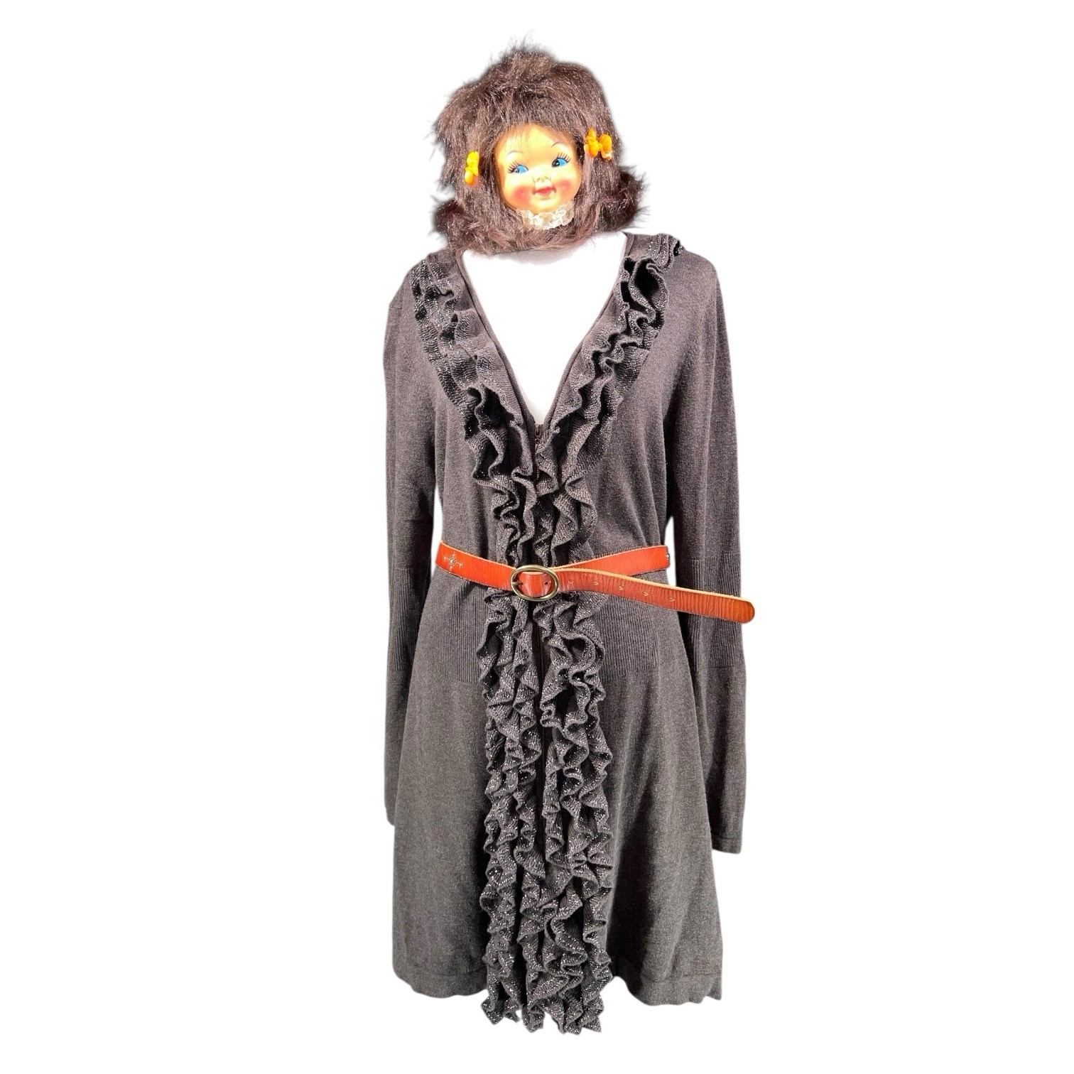 как выглядит VTG KNIT GLITTER RUFFLE DRESS SWEATER DUSTER JACKET HIPPY WHIMSICAL FOREST FAIRY фото