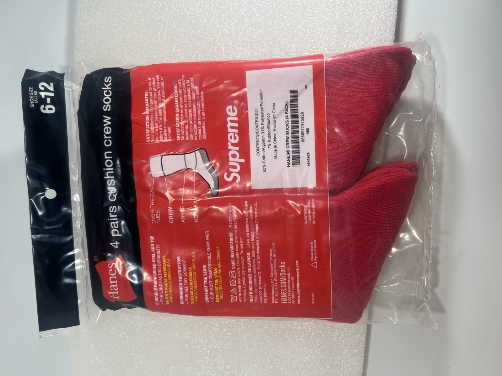 Supreme Hanes Crew Socks 4-Pack - Red - 100 Authentic -Sz-6-12