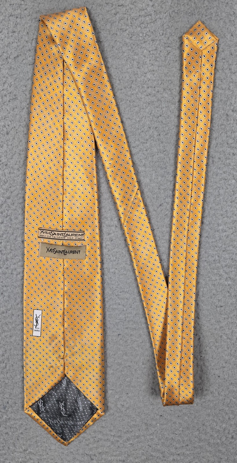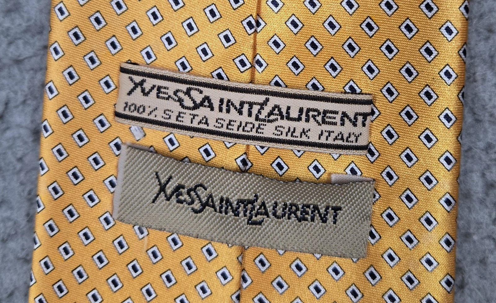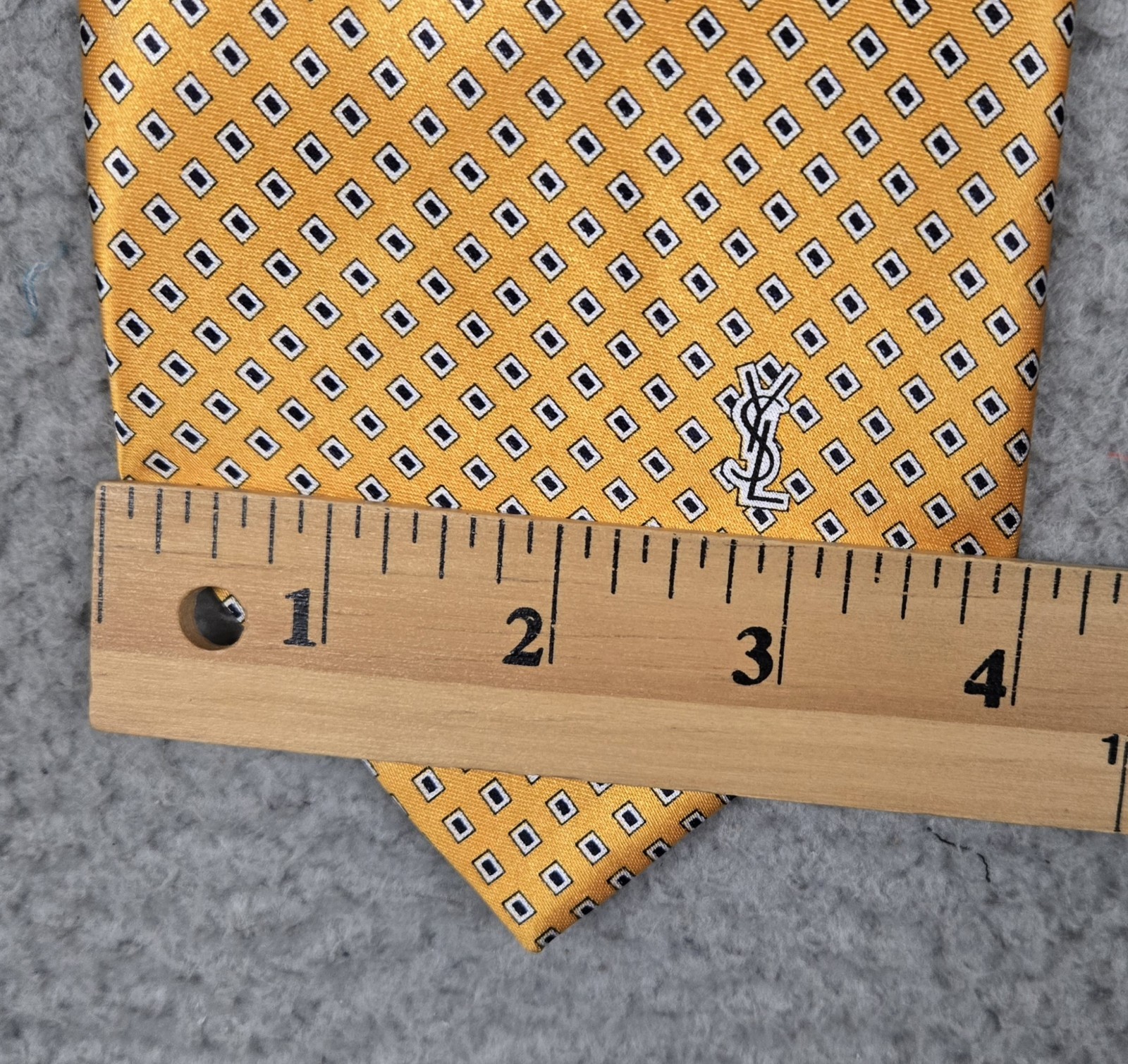 как выглядит Yves Saint Laurent VTG Short Wide Shiny Silk Satin Tie Gold Geometric 55 x 4" фото