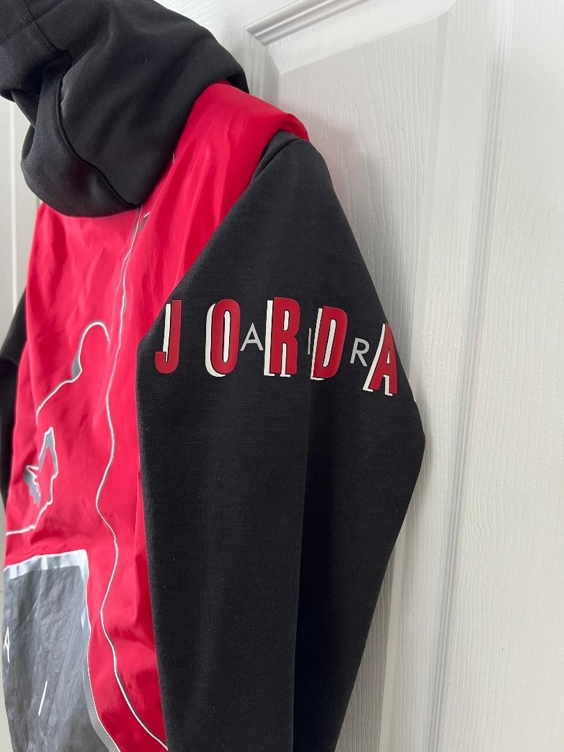 как выглядит Jordan Boys Hybrid Jacket with hood Youth M Red/Black Full Zip Sleeve Logo фото