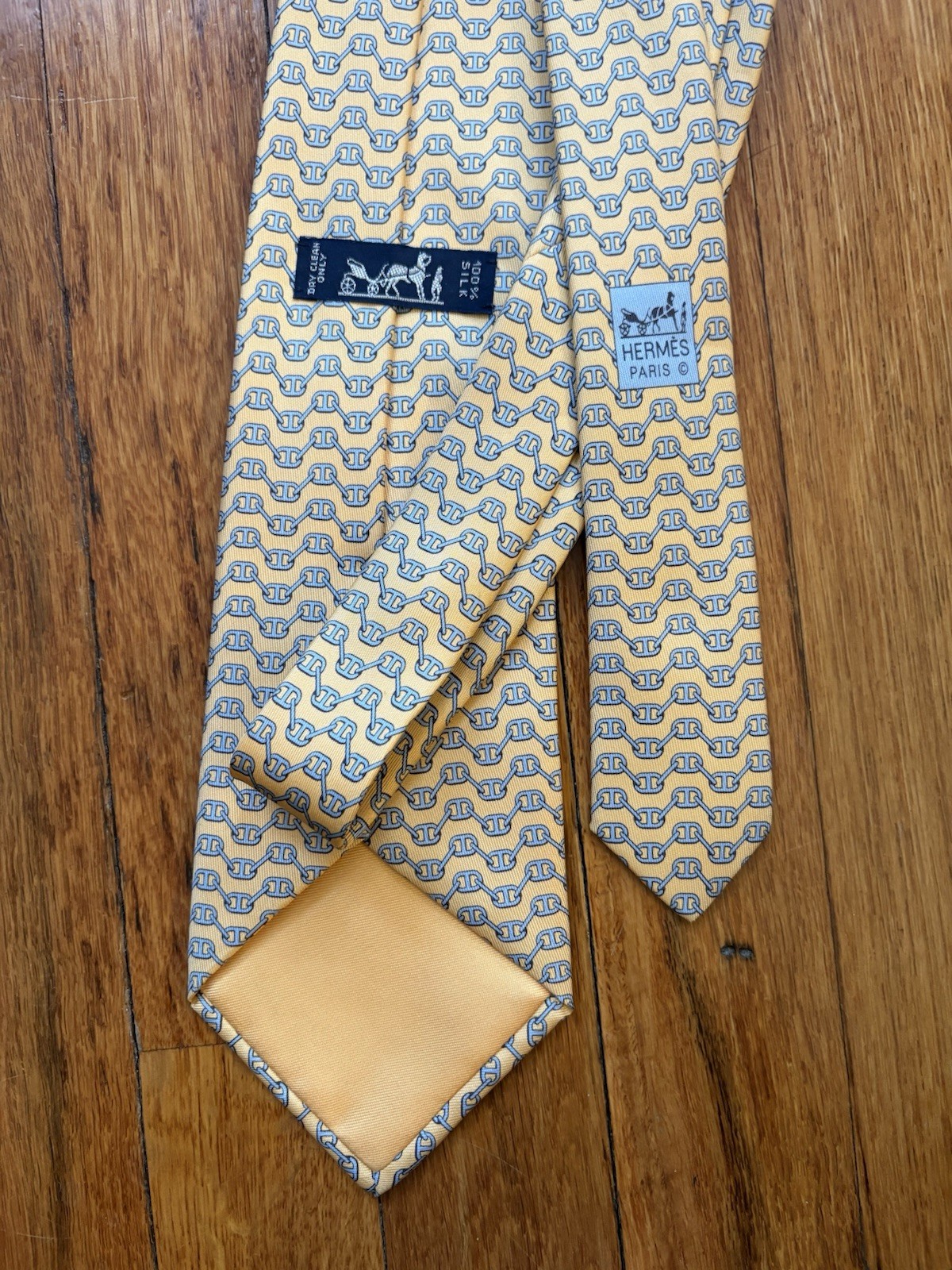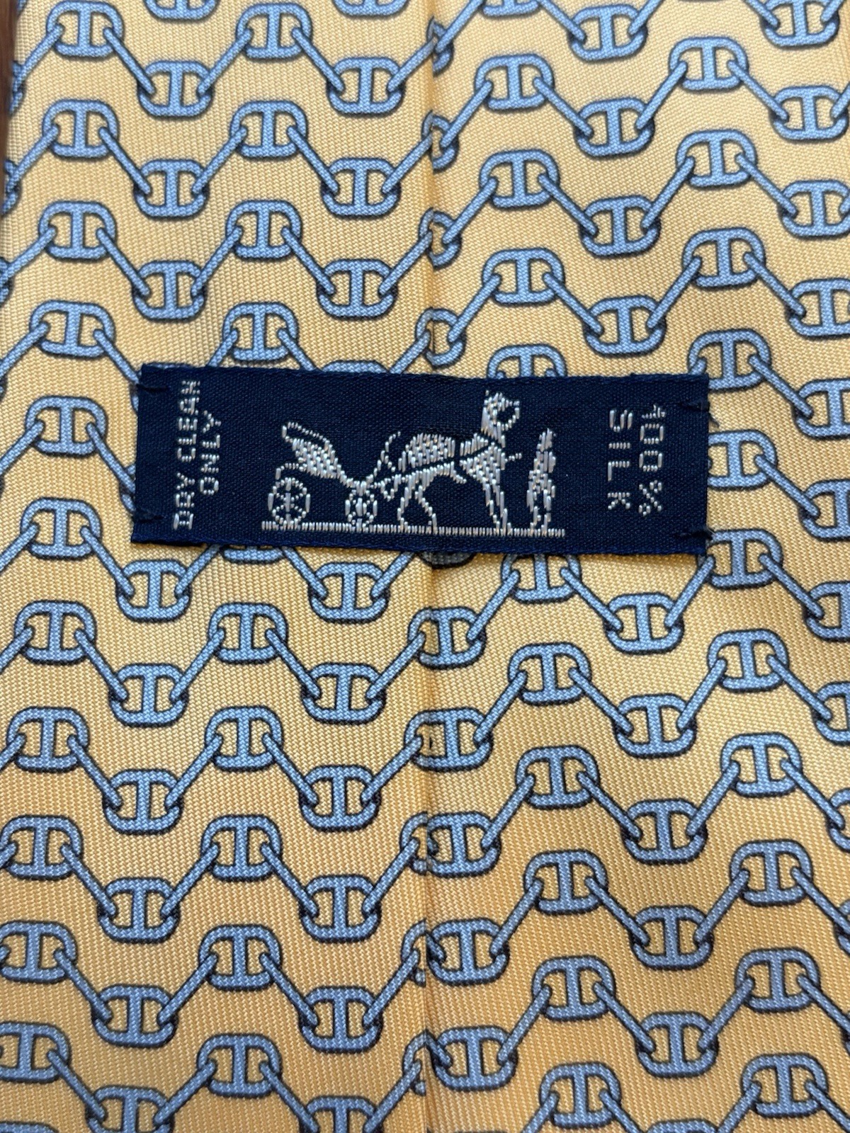 Hermes 100 Silk Tie Anchor Chain Pattern Pale Blue on Muted Gold 5325 TA