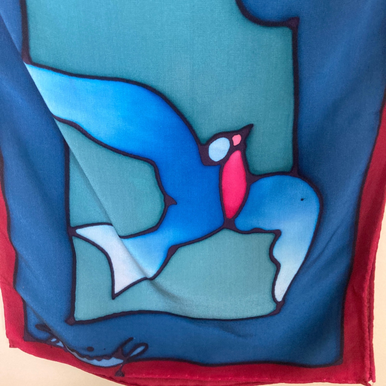 Vintage Silk Scarf Floral Birds unknown Artist Signed Blues Pinks Screenprint